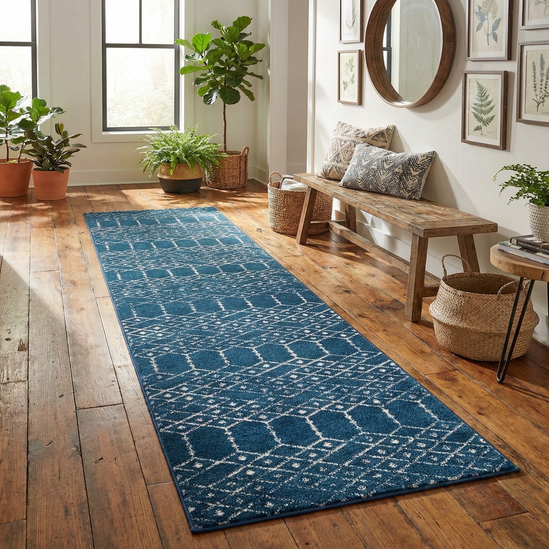 This runner works well in hallways, entryways, kitchens, or along stair landings where a long, narrow anchor is needed. Pair it with light wood floors and white trim to highlight the navy, or layer it with neutral upholstery and brass or matte-black accents for contrast. The clean geometry fits coastal, transitional, or modern farmhouse interiors and can also help define circulation routes in open-plan spaces.