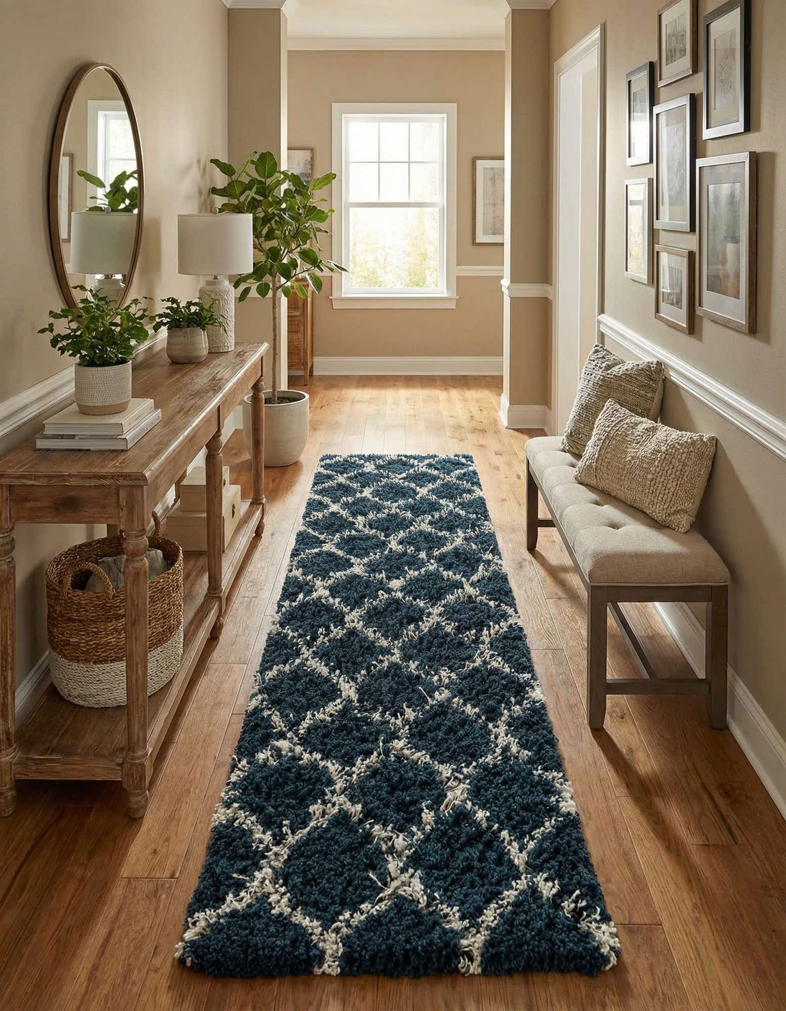 A 16 ft runner rug featuring a modern navy blue and white lattice shag pattern, ideal for a hallway.