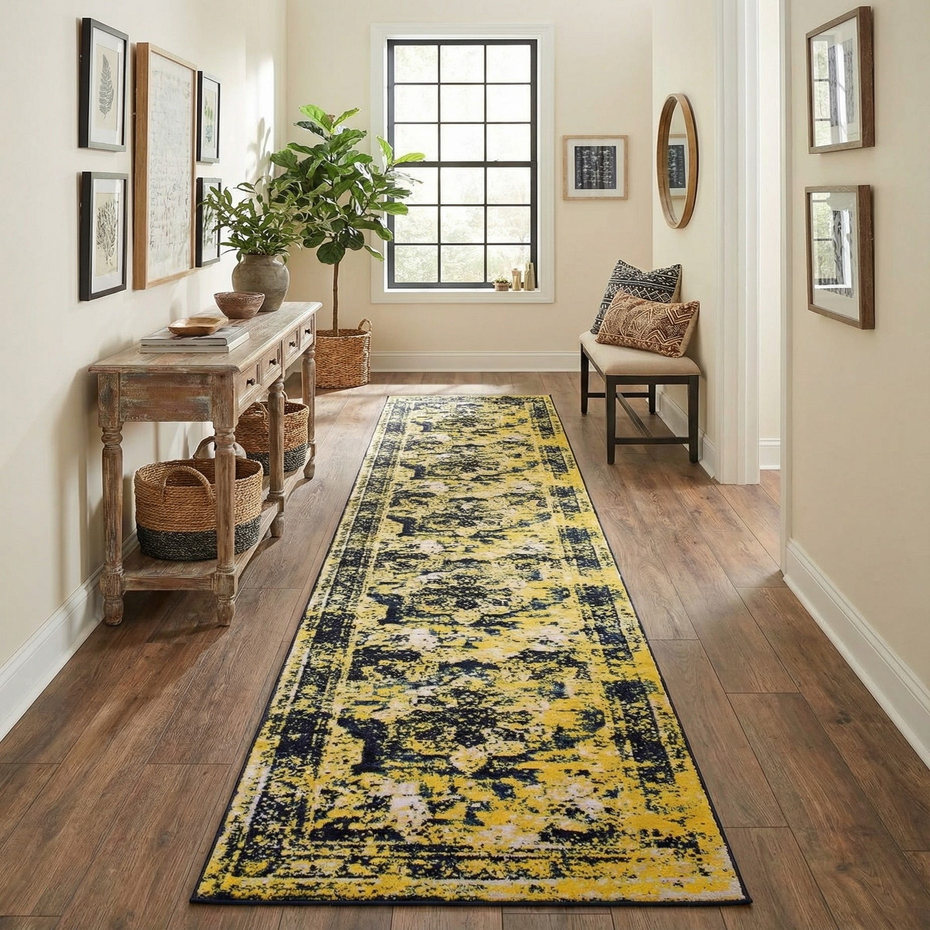 A long 20 ft runner rug in navy blue and bright yellow with a distressed Bohemian medallion pattern, ideal for a hallway.