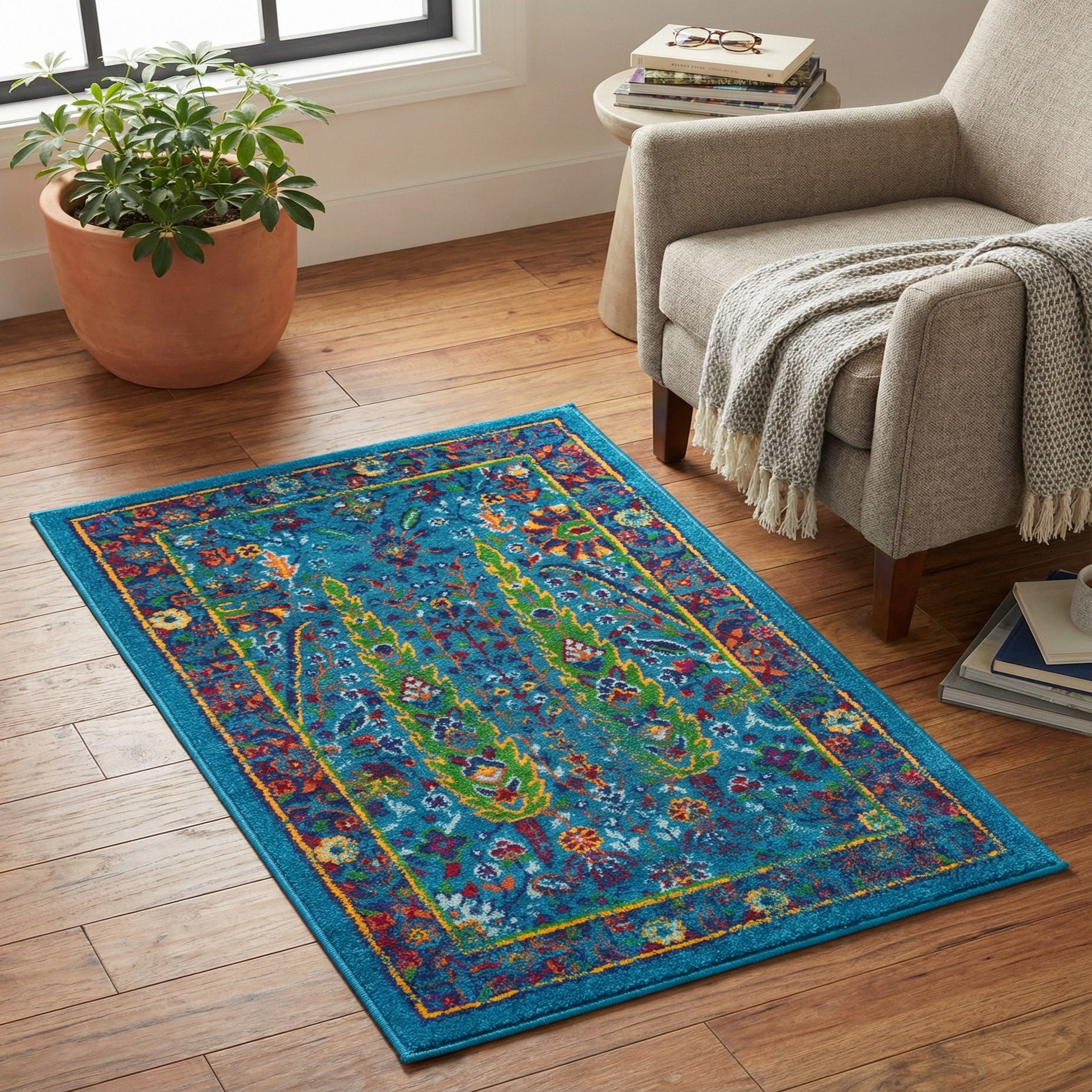 Machine made from 100% polypropylene, the rug has a low-to-medium pile with a soft, slightly cushioned hand and a uniform, durable surface that holds the pattern crisply. Use it as an entry accent, layered in a living area, in front of a kitchen sink, or beside a bed to bring color and pattern into small spaces. It pairs well with light or medium woods, rattan and wicker, and jewel-toned upholstery or simple neutral furnishings for an eclectic, global-inspired, or contemporary-traditional scheme.