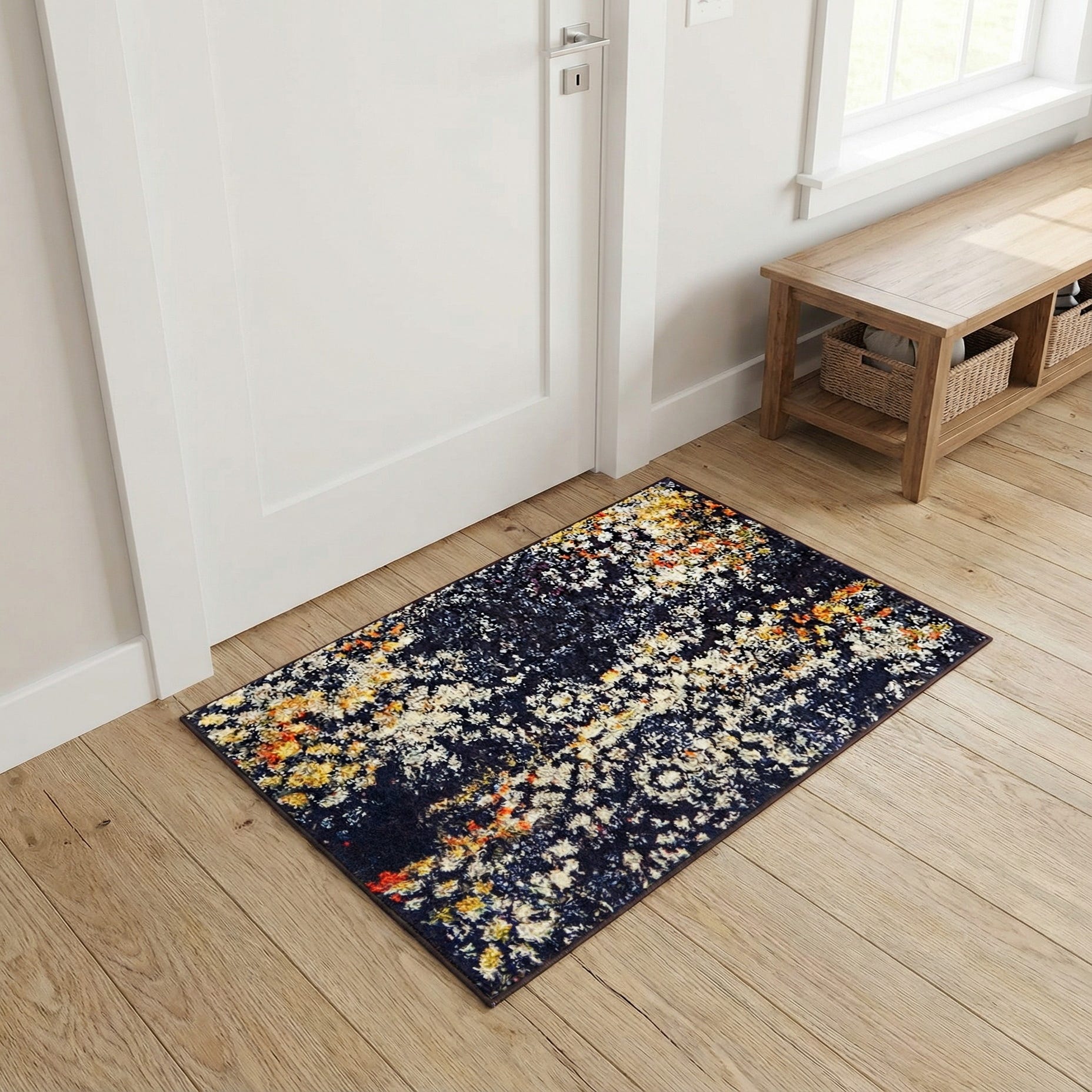 A deep navy field anchors this piece, layered with an abstract, painterly pattern of ivory flecks and cloud-like clusters that form soft vertical movement across the surface. Small pops of orange and yellow brighten the composition while touches of blue, brown and black add depth and contrast. The overall look is contemporary and artful—an abstract expression of color and texture that reads as a modern accent rather than a formal medallion.