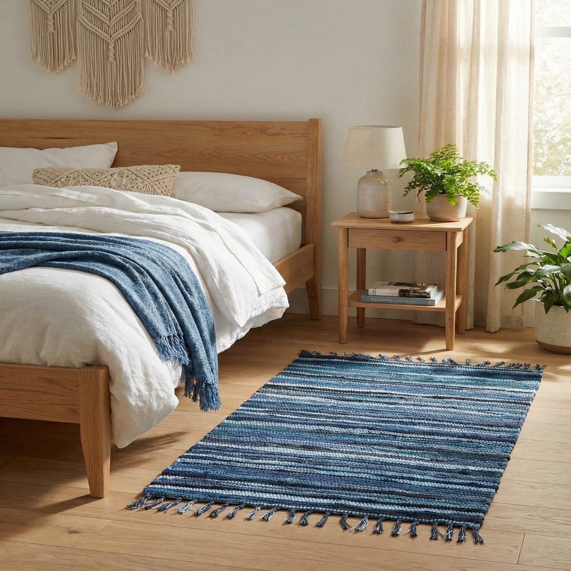 This laid-back linear design pairs easily with casual, coastal, or bohemian interiors. Place it in front of a light-colored sofa or layered on wood floors to add depth, use it as a compact accent in an entryway, or tuck it into a reading nook to bring cool blue tones into the space. It also complements white-washed furniture, warm oak, denim upholstery or worn leather for a relaxed, lived-in look.