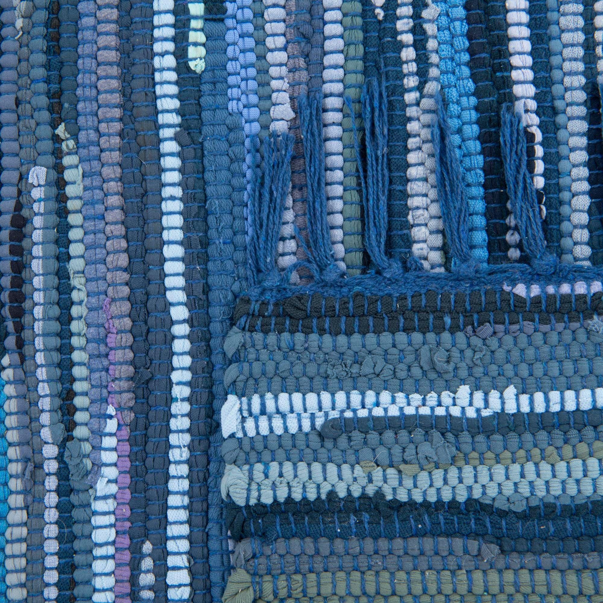 A 2x3 rectangular Chindi Cotton rug featuring varied horizontal stripes in shades of blue, navy, and white, with fringed ends.