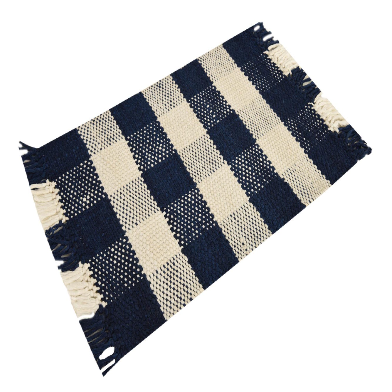 A classic plaid rendered in navy and ivory, this rug presents a bold check pattern with a navy blue background that anchors each alternating ivory square. The weave alternates tightly packed navy blocks with more open, textured ivory sections, creating subtle depth and a comfortable tactile contrast. Finished with short fringed ends, the surface reads low-profile yet textured, with a firm hand that holds its shape underfoot.
