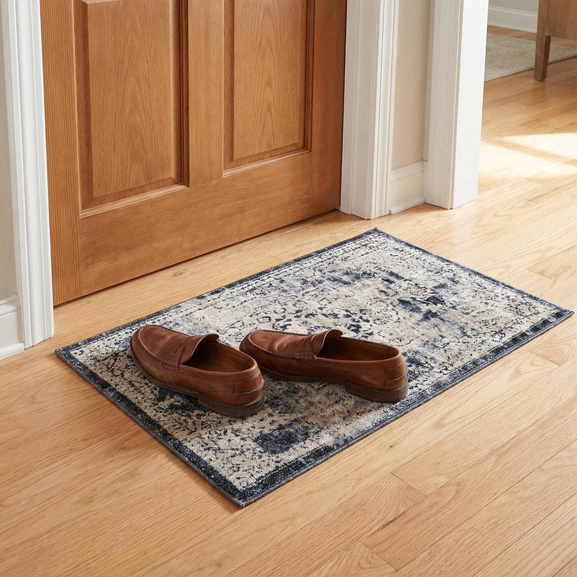 Machine-made from 85% polypropylene and 15% chenille, the rug offers a soft, slightly plush hand—chenille threads add a velvety feel while polypropylene provides structure for regular use. Its low-to-medium pile gives tactile variation across the patterned surface. Use it to anchor a seating area with neutral upholstery and warm wood tones, tuck it under an entry bench to add instant character, or place it beside a bed or chair to introduce texture and a touch of classic style to modern and transitional interiors.