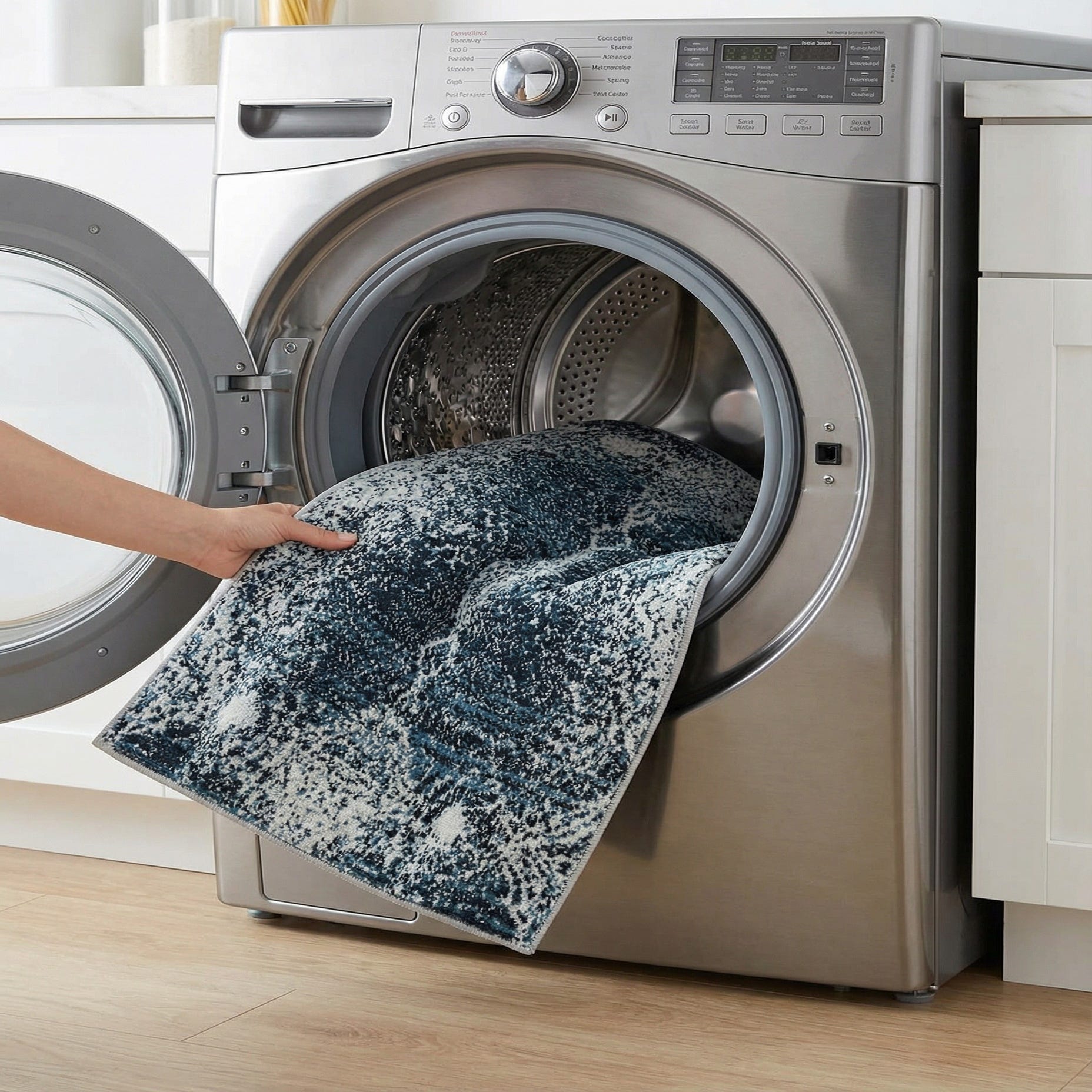 A 2x3 rectangular Kamala Washable rug featuring a distressed traditional medallion pattern in shades of navy blue, light blue, and white.