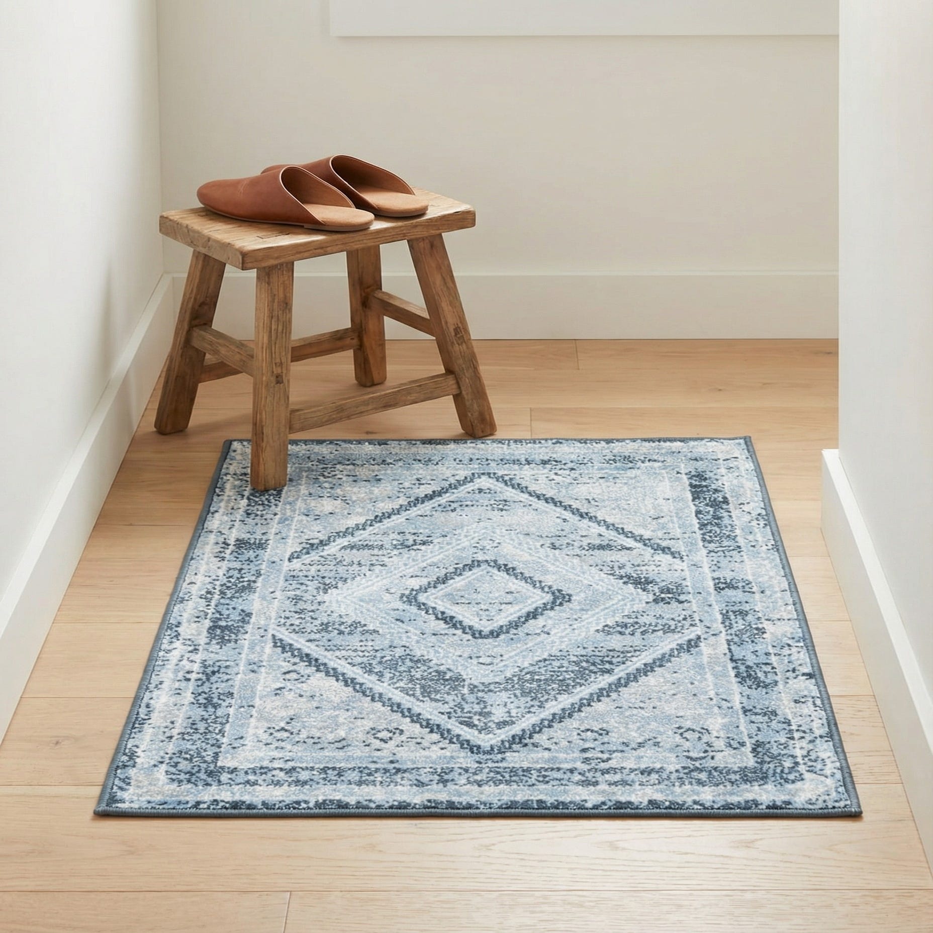 Primary color is Navy Blue. Colors in this rug include: Navy Blue, Blue, Ivory, Light Blue.