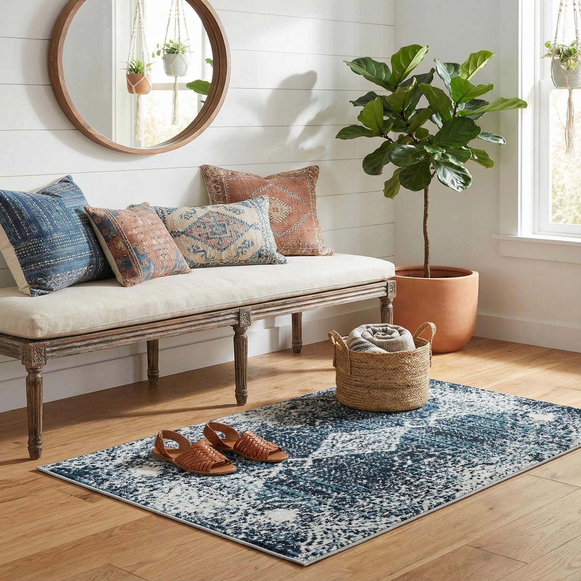 A 2x3 rectangular Kamala Washable rug featuring a distressed traditional medallion pattern in shades of navy blue, light blue, and white.