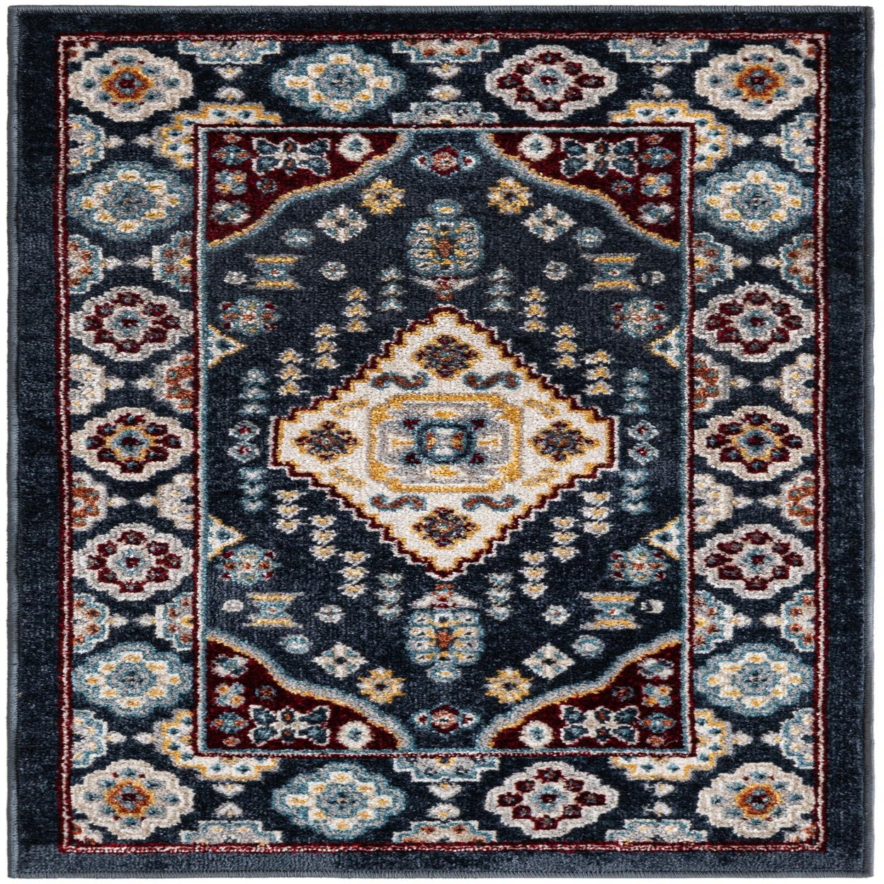 Primary color is Navy Blue. Colors in this rug include: Navy Blue, Ivory, Gray, Red, Yellow.