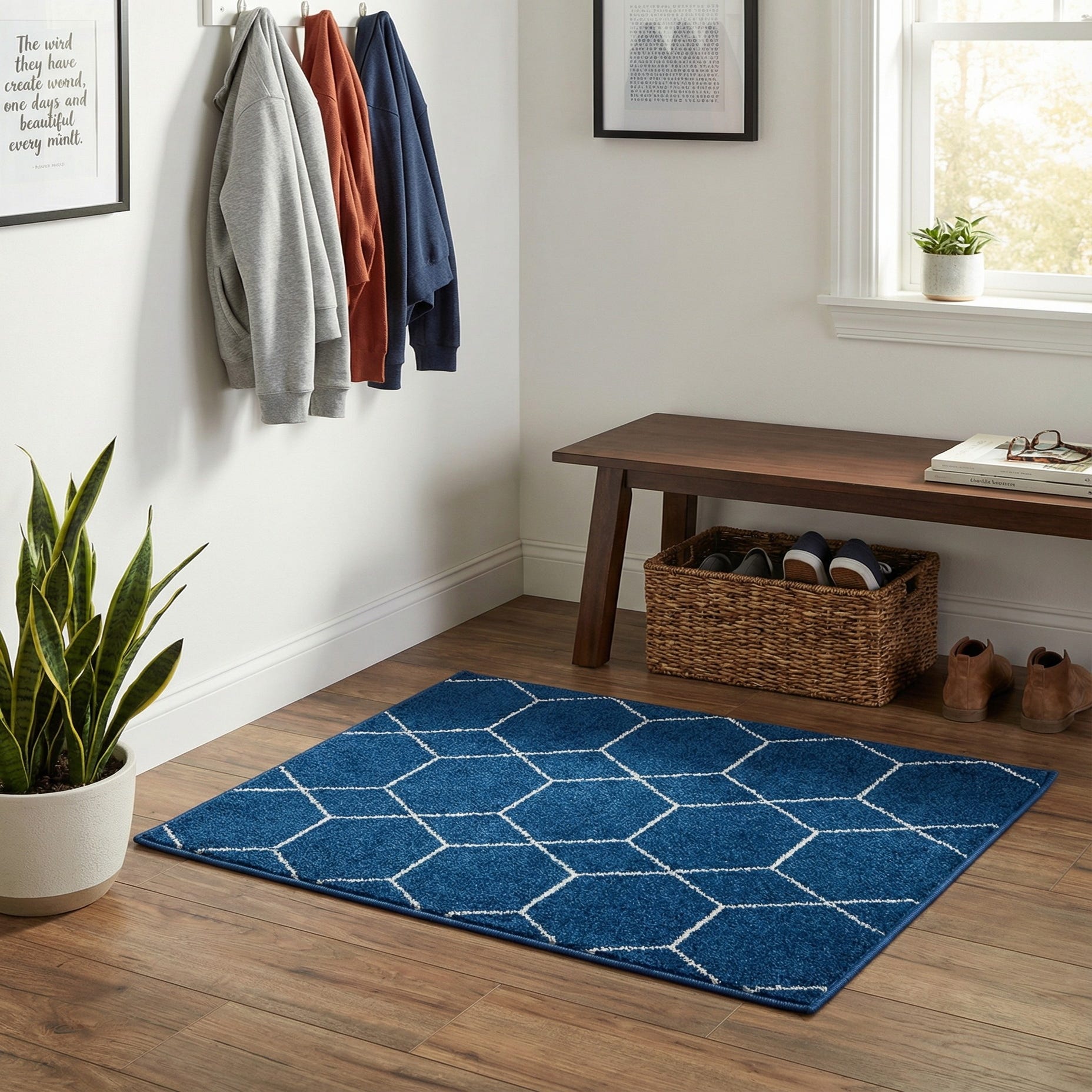 A 2x3 rectangular navy blue modern rug with a white geometric trellis pattern, suitable for an entryway.