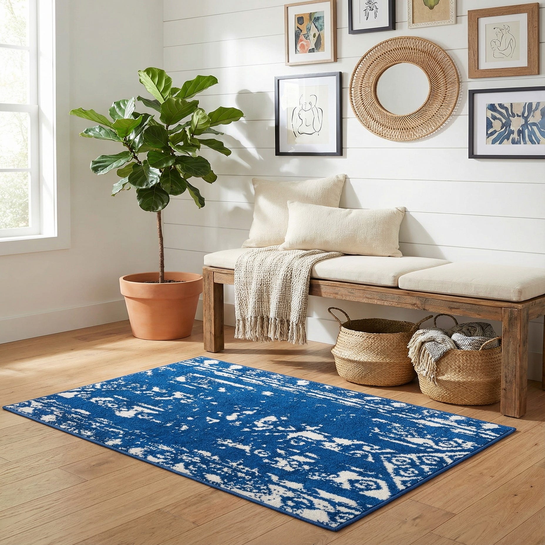 A 2x3 rectangular Rugs.com Lennon rug in navy blue and white with a distressed Southwestern tribal pattern.