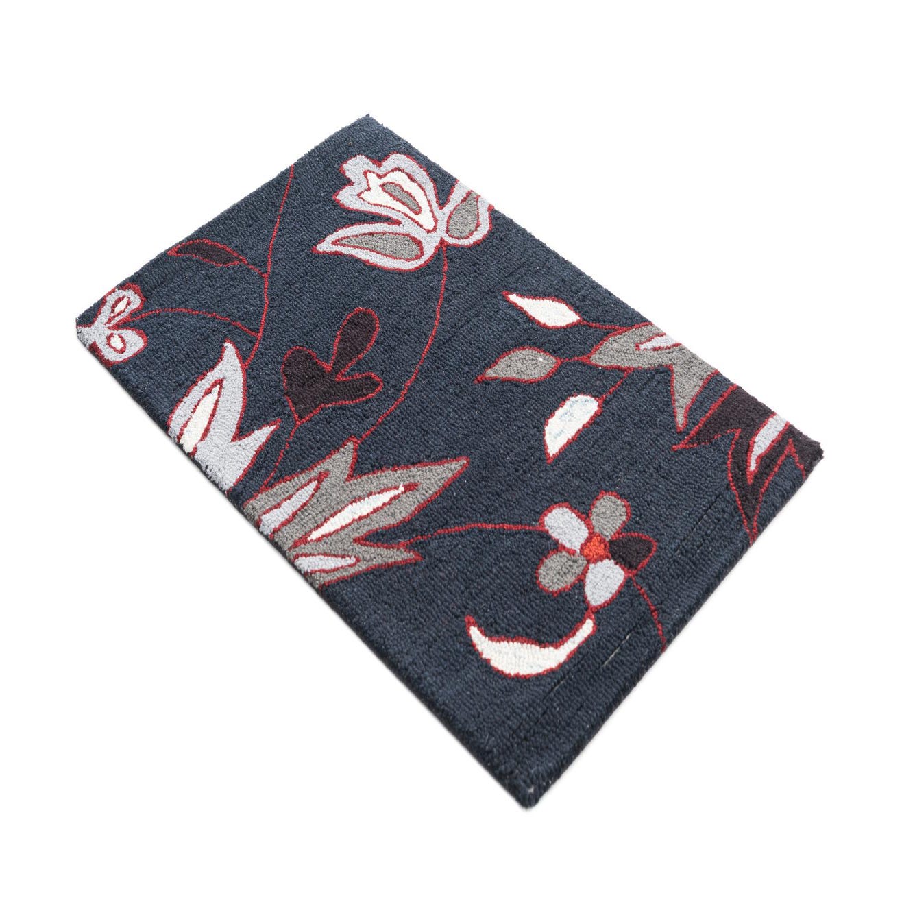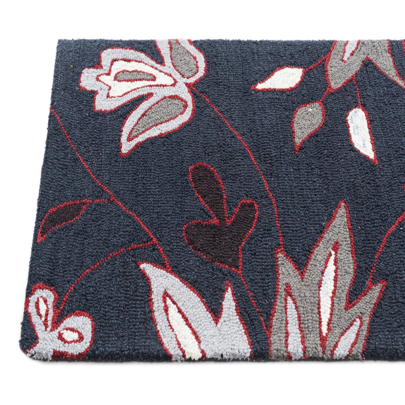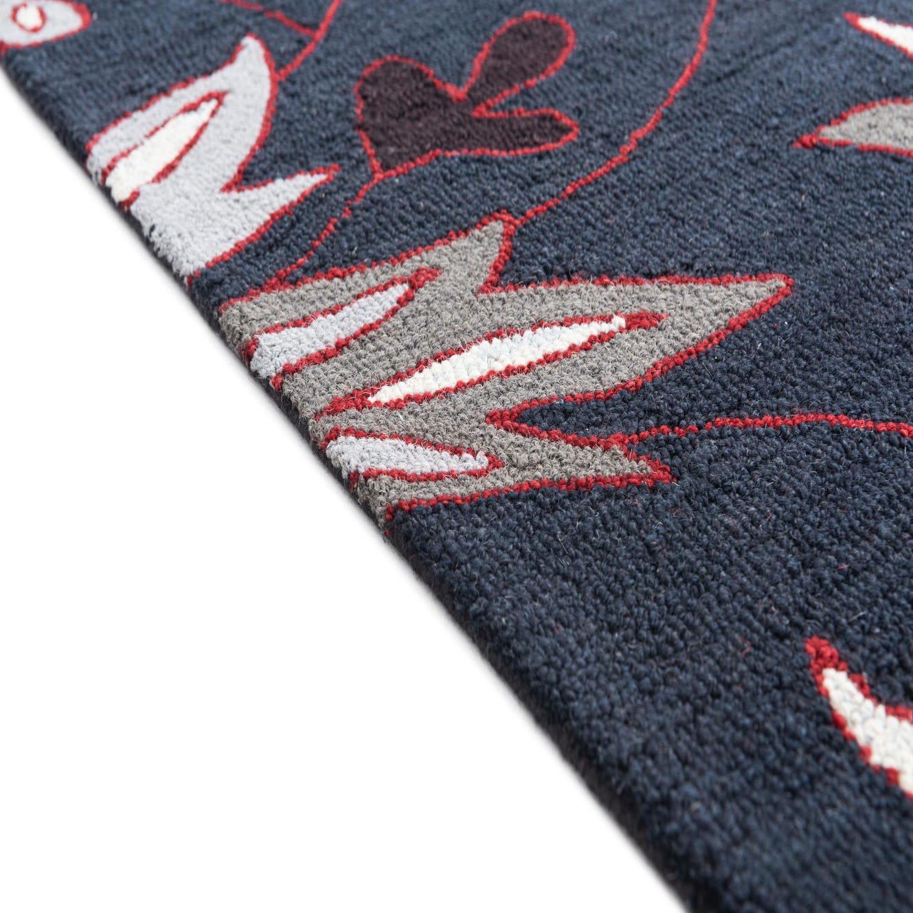 The Luna collection offers a sophisticated navy blue hand-tufted rug crafted from a blend of wool and cotton, which lends a plush feel underfoot. This 2x3 piece features a dynamic botanical pattern with accents in red, gray, and ivory that gracefully contrast with the deep navy background. The texture and weave enhance the visual depth of the design, making it a statement piece for the floor.