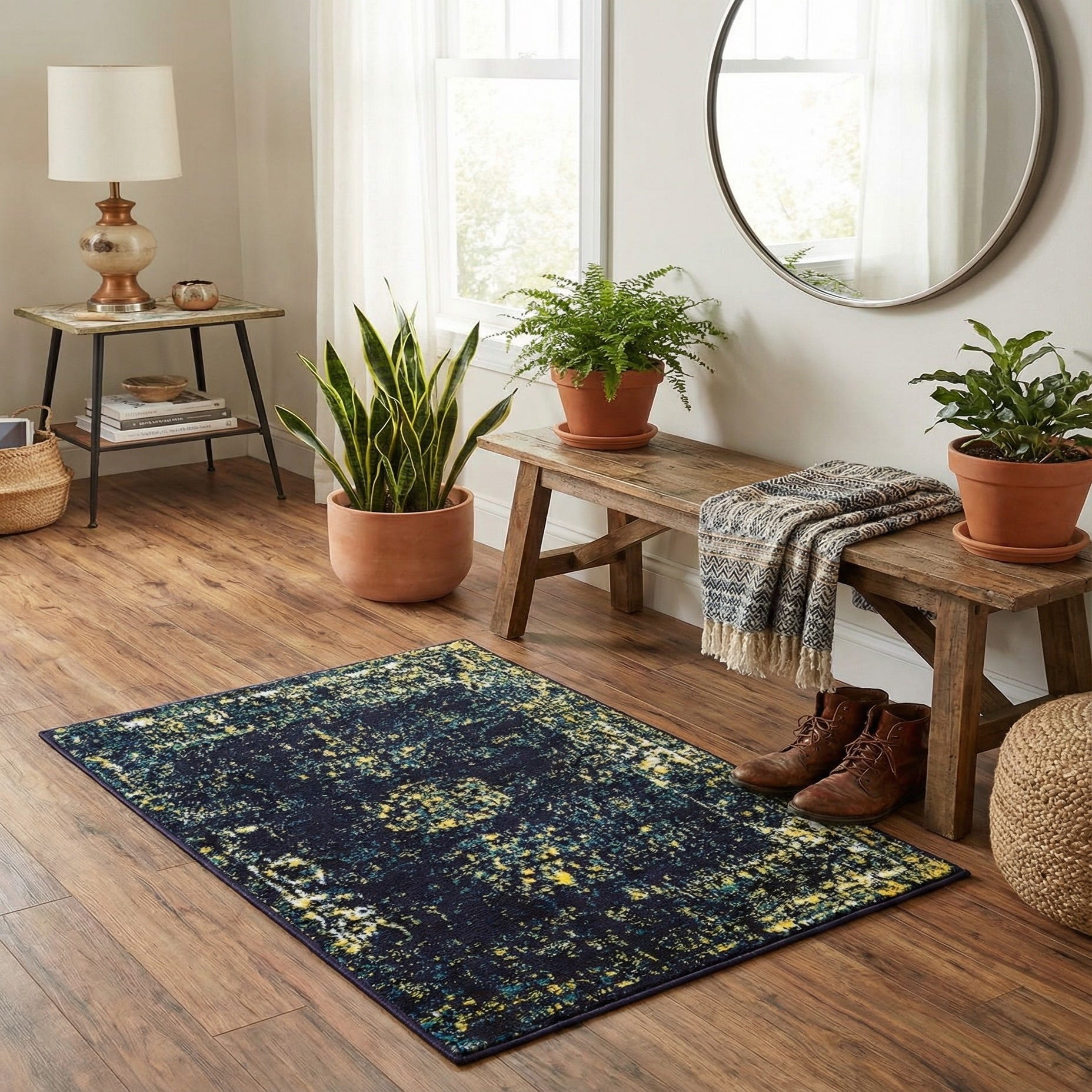 A 2x3 rectangular Monte Carlo rug featuring a distressed bohemian pattern in shades of navy blue, yellow, and teal.