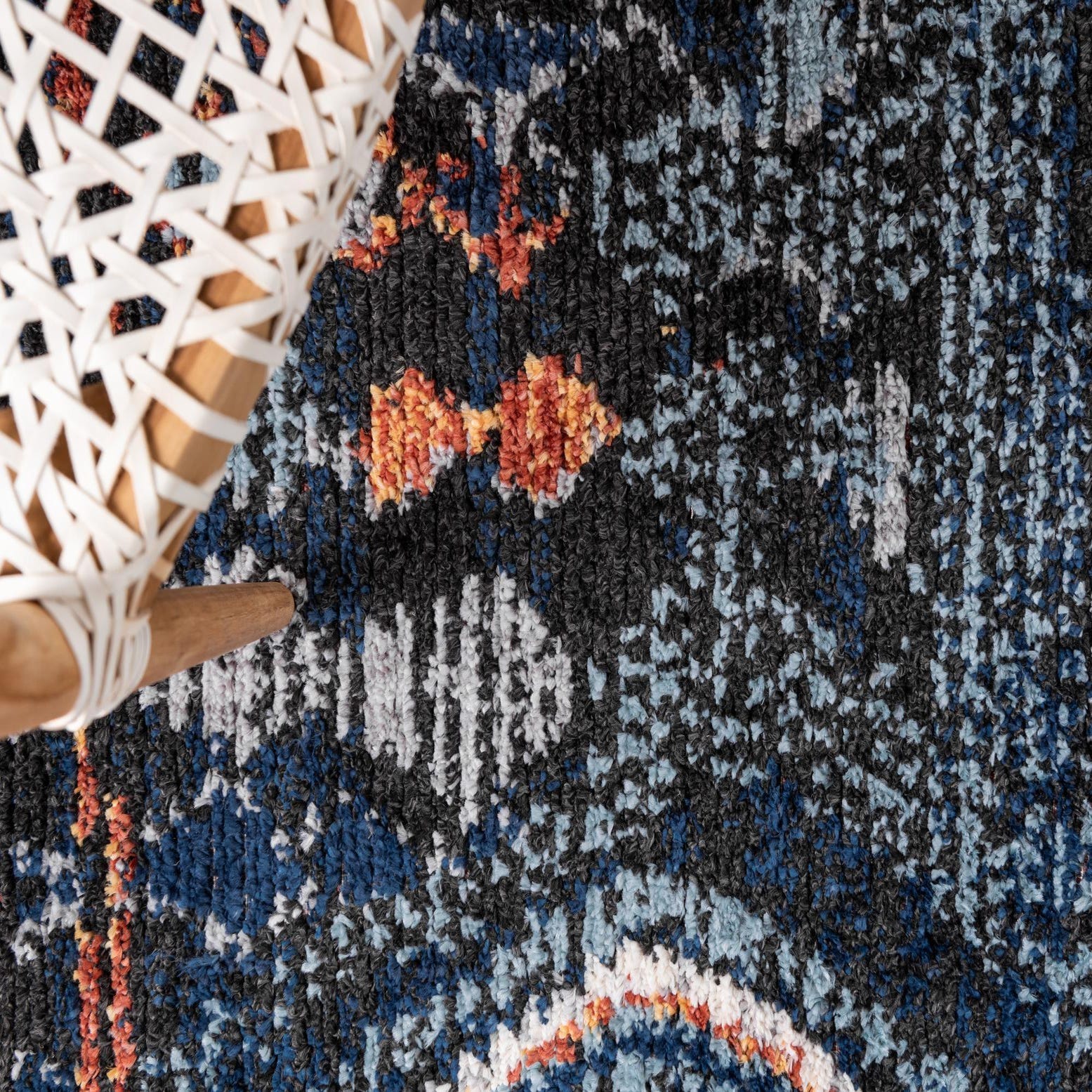 A deep navy ground anchors a worn, Moroccan-inspired pattern of small diamond medallions and scattered motifs in ivory, black, rust red and touches of yellow. The design has a layered, distressed appearance with irregular speckling and color shifts that give it visual depth without feeling fussy. Machine-made from 100% polyester, the surface has a low-to-medium textured pile with a slightly nubby hand you can feel underfoot—soft to touch yet structured enough to hold the pattern’s fine, weathered detailing.
