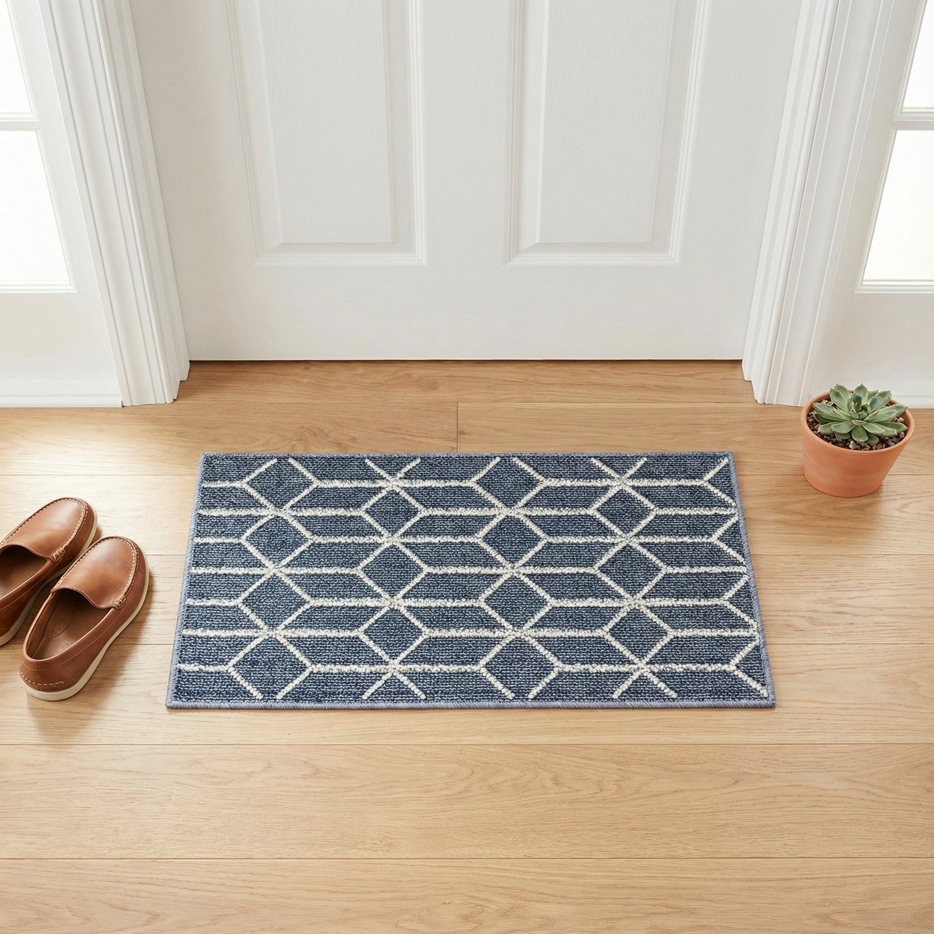 A deep navy ground forms a tightly woven, low?profile base while a raised ivory lattice weaves a geometric, cube?like motif across the surface. Running your hand over the rug, the ivory lines register as a subtly looped texture against the firmer navy weave, giving the design clear definition and a pleasant contrast between smooth and raised surfaces. Constructed of 100% polypropylene, the piece maintains its structure and color clarity while presenting a clean, contemporary look.