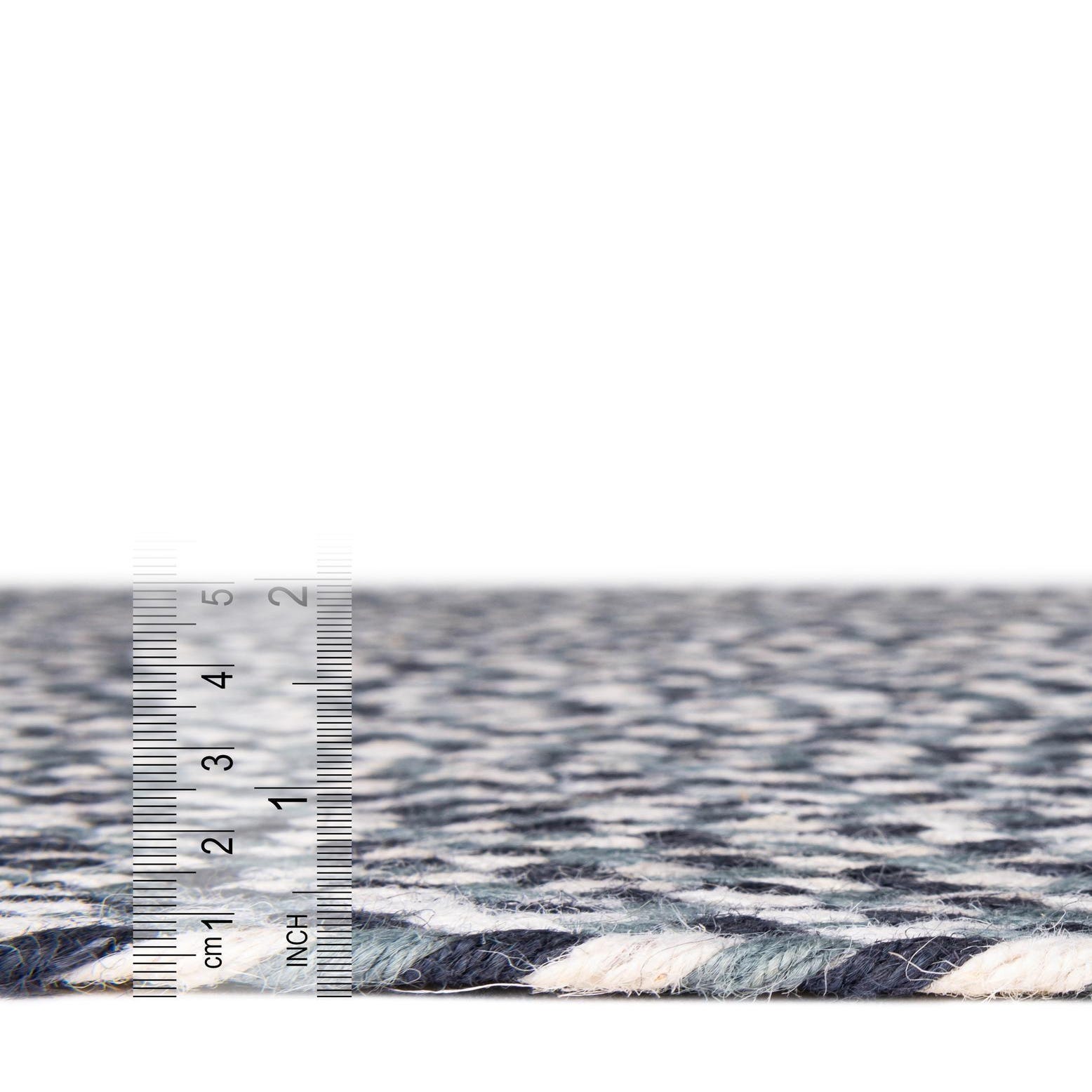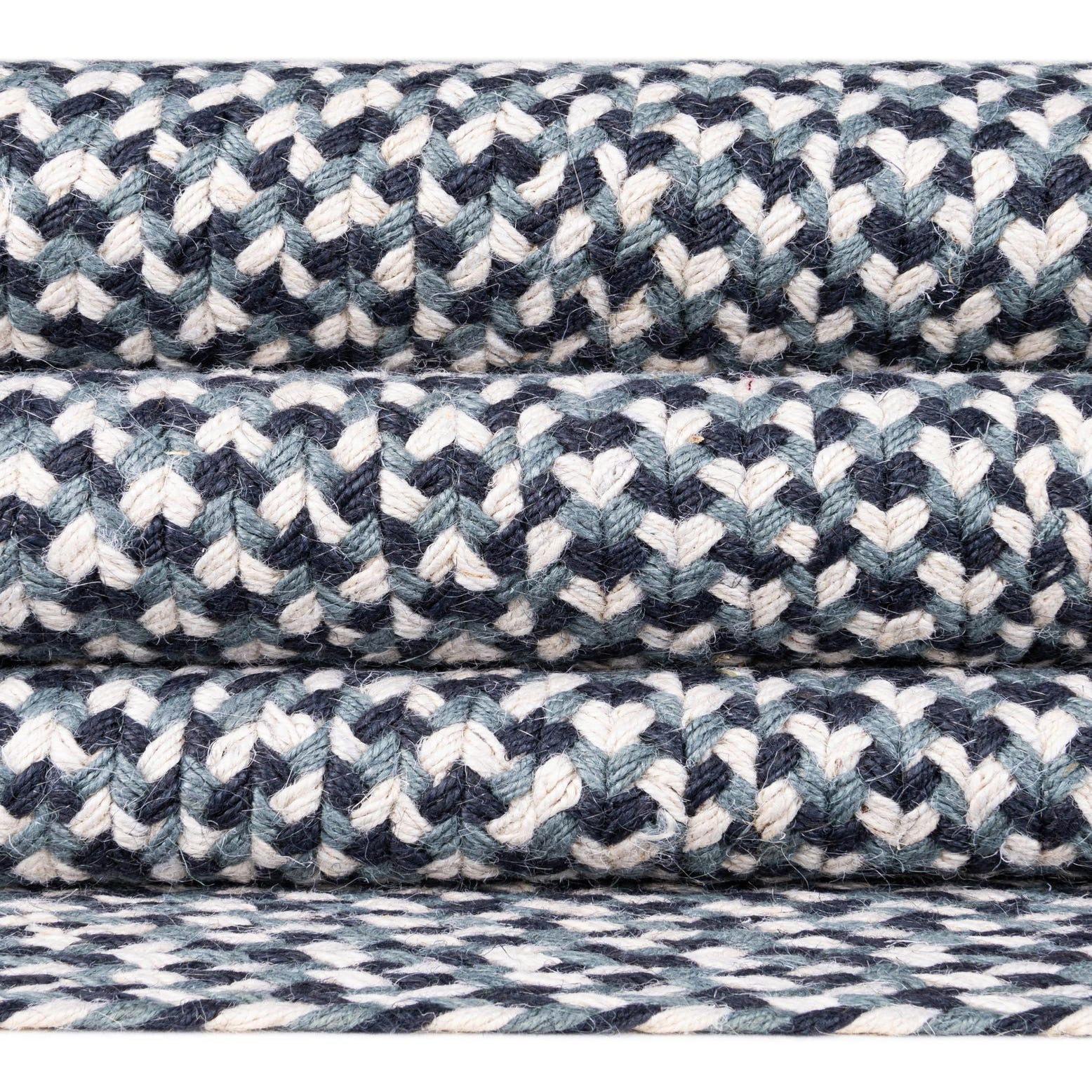 A 2' 0 x 3' 1 oval braided jute rug in shades of navy blue, light blue, and cream, featuring a modern, textured pattern.