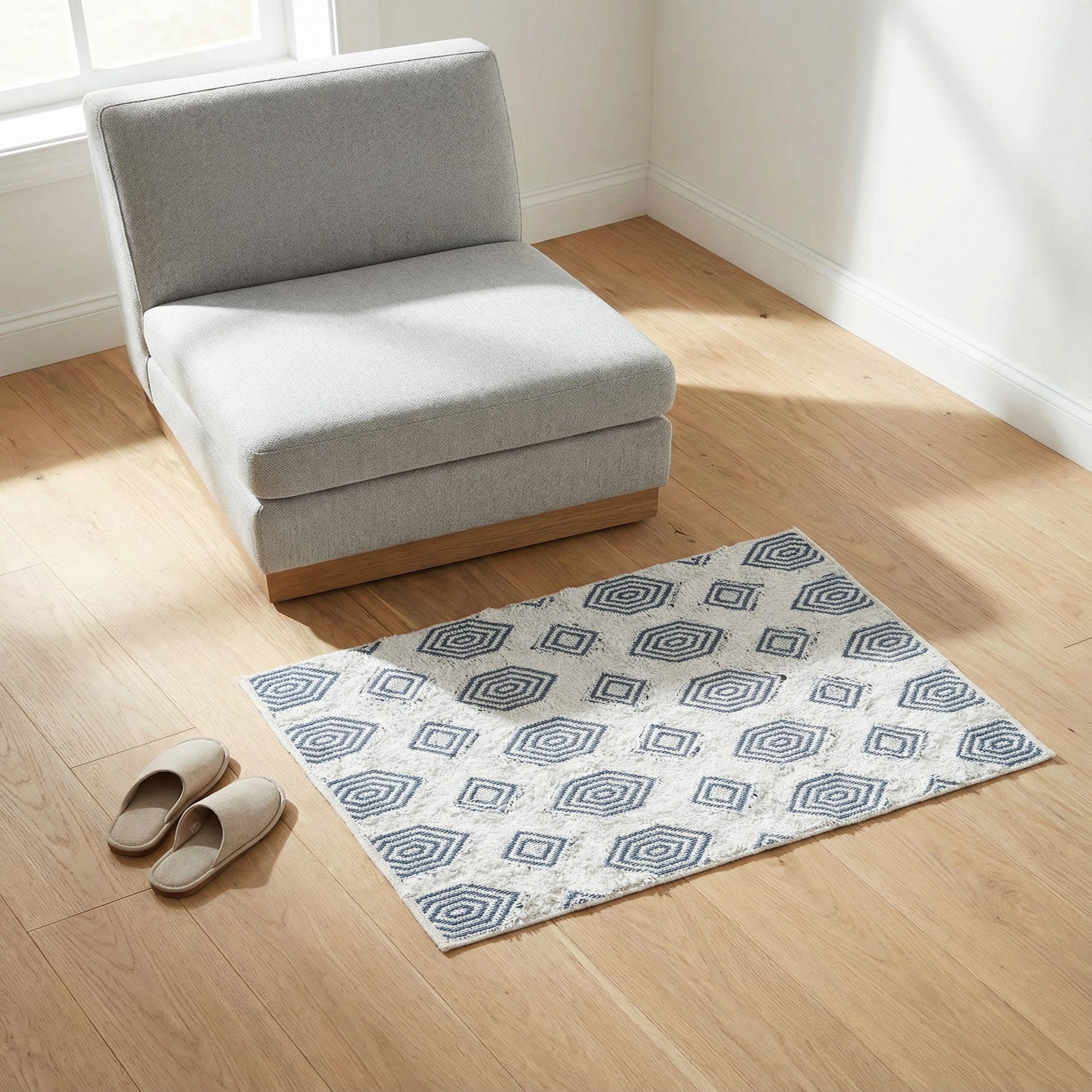 Machine-made from 100% cotton, the surface has a pleasing tactile quality—soft to the touch with a subtle high-low texture where the ivory tufting lifts above the navy base. That cotton feel keeps the rug approachable and comfortable underfoot. Its scale and style make it well suited for casual living spaces: place it under a small seating cluster, beside a bed, in a reading nook, or in an entryway to add pattern and softness. The navy-and-ivory palette pairs nicely with coastal, modern farmhouse, or contemporary interiors and works well with natural woods, crisp whites, and brushed-metal accents.