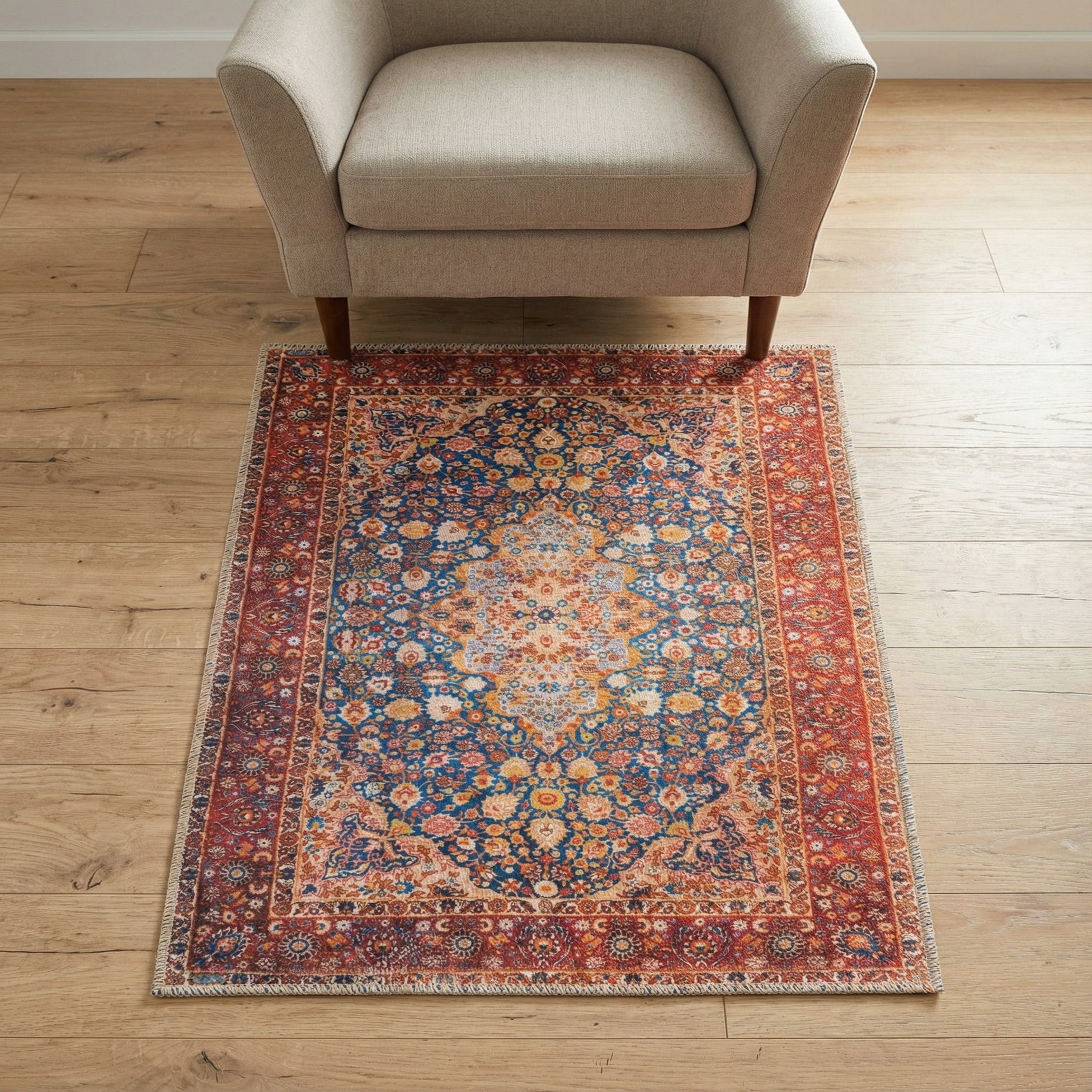 A richly detailed medallion design settles against a navy blue background, where layered floral motifs and vine work form a classic Persian-inspired layout. Warm orange and beige tones define the central medallion and border, while pops of blue, ivory and olive thread through the field to create depth and contrast. Narrow inner borders and a wider rust-orange outer border frame the pattern, and short fringe at the ends gives a finished, traditional look.