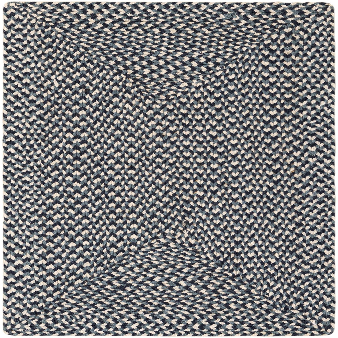 A tight, hand-braided construction of 100% jute forms a compact rectangular pattern that reads both casual and refined. Navy blue provides a deep background while interwoven strands of ivory and light blue create a subtle tweed effect that runs in concentric bands across the surface. The braided ropes produce a low, textured profile you can feel underfoot — firm and slightly coarse with visible fiber variation that gives the piece tactile interest.