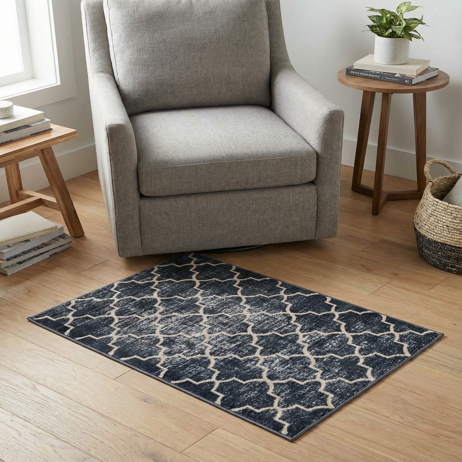 This compact rug works well in small or transitional spaces where you want a bold pattern without overwhelming the room — try it in an entry, in front of a sink, beside a bed, or layered on top of a larger neutral area rug. Pair it with light wood tones and white or warm gray furnishings to let the navy anchor the palette, or use it to add contrast to a coastal or contemporary scheme.