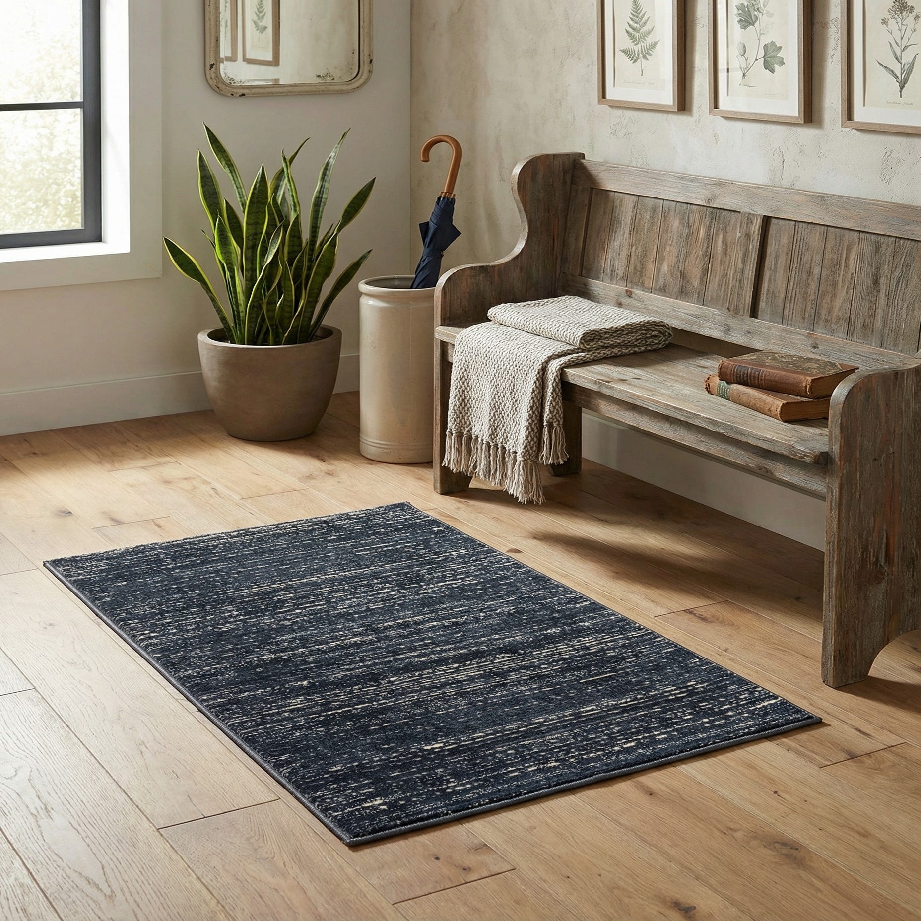 This piece works well in compact, high-activity spots where a grounded dark tone is helpful — think an entryway, hallway, in front of a sink, or layered beneath a small seating vignette. The navy base pairs cleanly with light- to medium-toned woods, cool metals, and neutral textiles, while the ivory flecks bring a touch of contrast that complements both modern and transitional interiors.