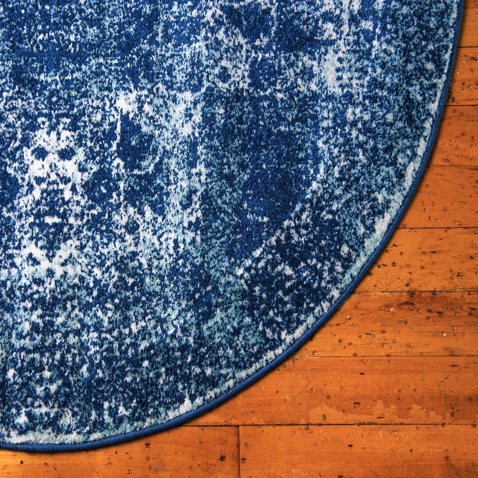This round piece works well as a statement for smaller seating nooks, beneath a round café table, or layered in an entryway to add color without overwhelming the space. It pairs naturally with light- or medium-toned woods, linen upholstery, and navy or ivory accents for a coastal, transitional, or modern farmhouse interior. For a more contemporary contrast, combine it with sleek metal finishes and clean-lined furniture to balance the rug’s traditional motif.