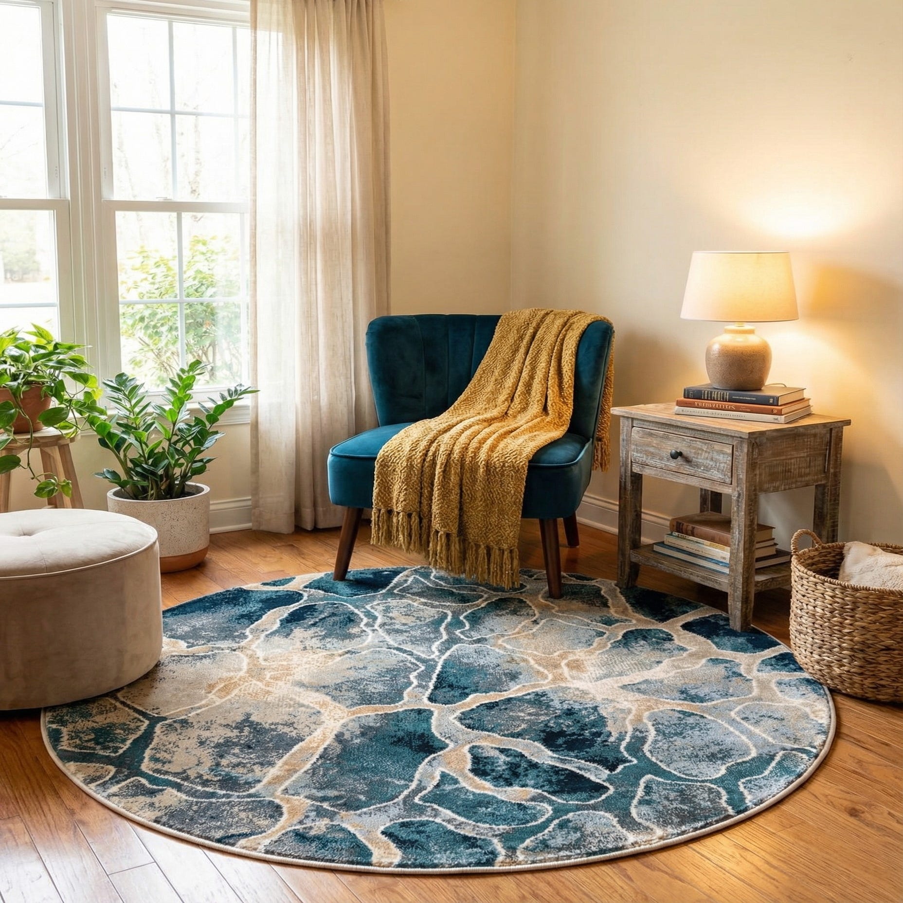 This round design works well in smaller seating areas, a cozy breakfast nook, or as an accent in an entry or bedroom—ideal for defining a space without competing with existing furnishings. Pair it with light oak or honey-toned woods, tan leather, and linen textiles for a relaxed, contemporary look, or use navy and light-blue accents to tie into a coastal-inspired palette. The pattern also layers nicely over hardwood or tile, bringing warmth and visual interest to transitional and modern interiors.