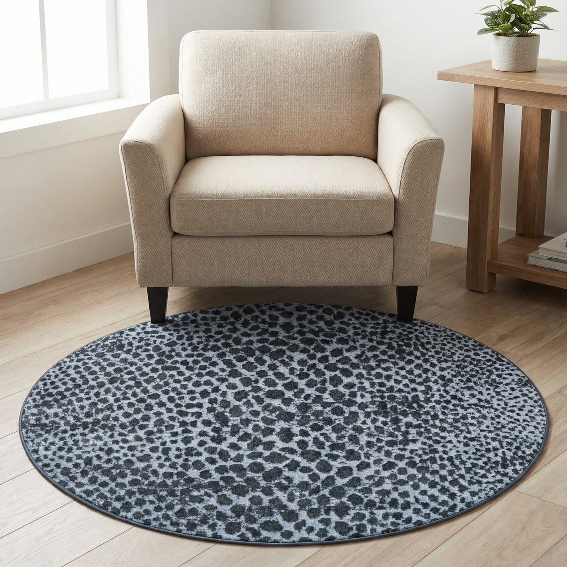 This contemporary round rug can serve as a focal point in a minimalist setting or complement a modern interior with its abstract allure. It would be especially fitting in spaces such as a chic entryway, under a contemporary coffee table, or as an accent piece in a sleek office. The round shape and engaging pattern would also work well to soften the lines in a square or angular room, while its color scheme pairs nicely with neutral tones or can be used to balance out vibrant decor elements.