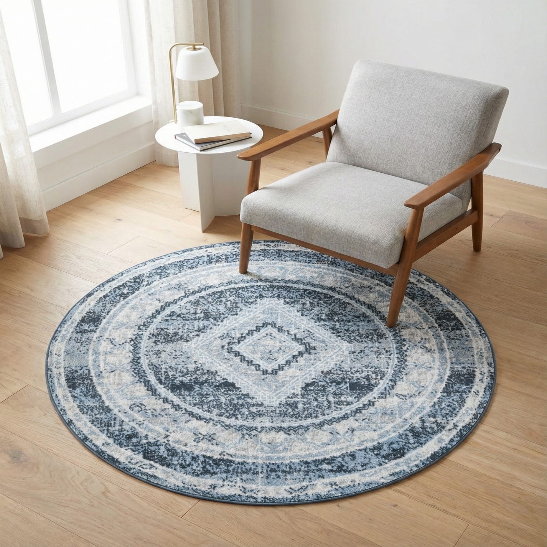 A vintage-inspired medallion pattern sits at the center of this round rug, surrounded by concentric borders that give it a layered, slightly weathered look. The background is a deep navy blue, with motifs rendered in blue, light blue, and ivory that create a soft, dimensional contrast. Machine-made of 100% polyester, the rug has a low-pile, smooth surface with a gentle, soft hand and a subtle sheen that catches light without overpowering the pattern.