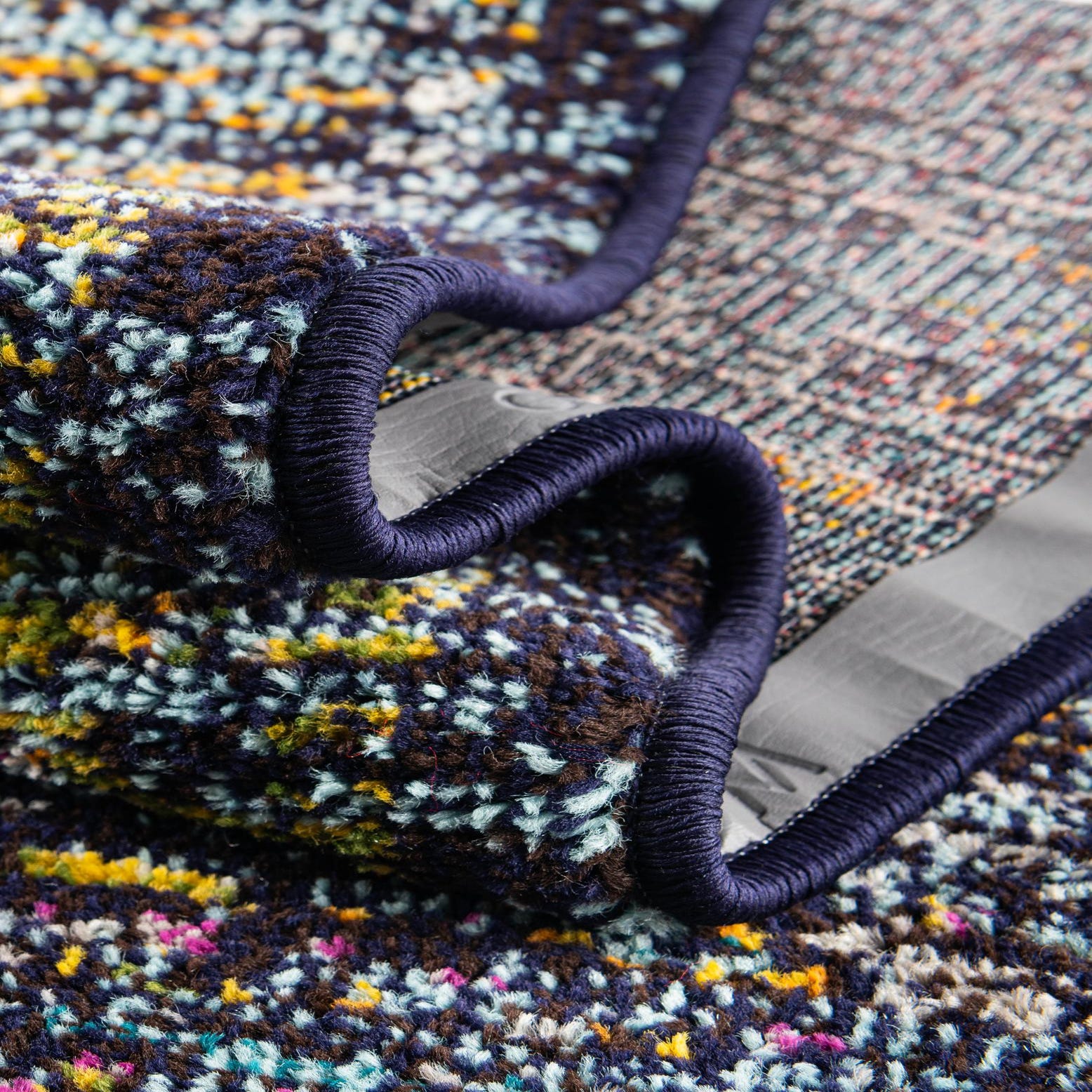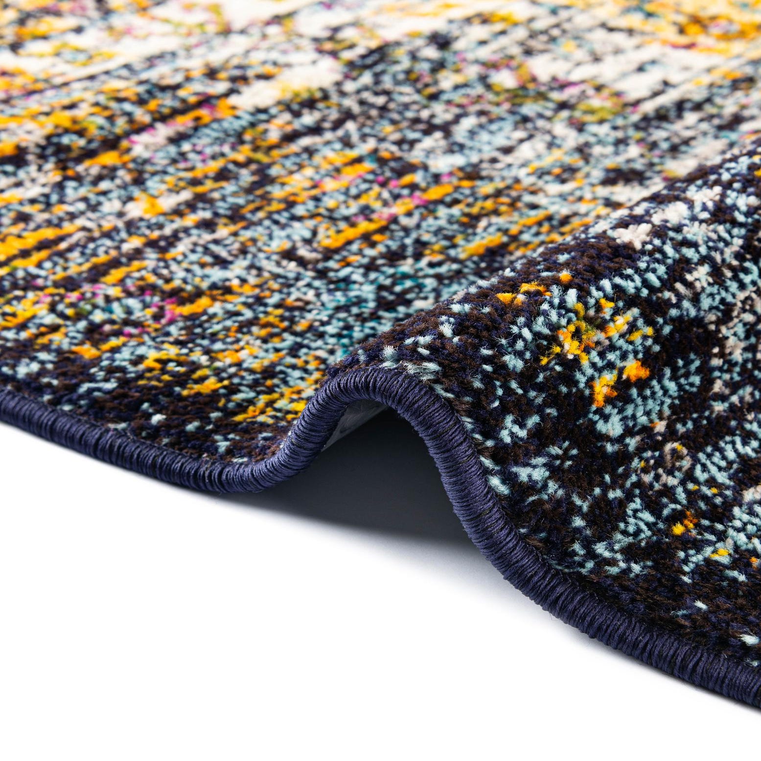 A 3' 0 x 3' 0 round rug featuring a distressed, abstract pattern with vibrant blues, yellows, and hints of purple on a dark background.
