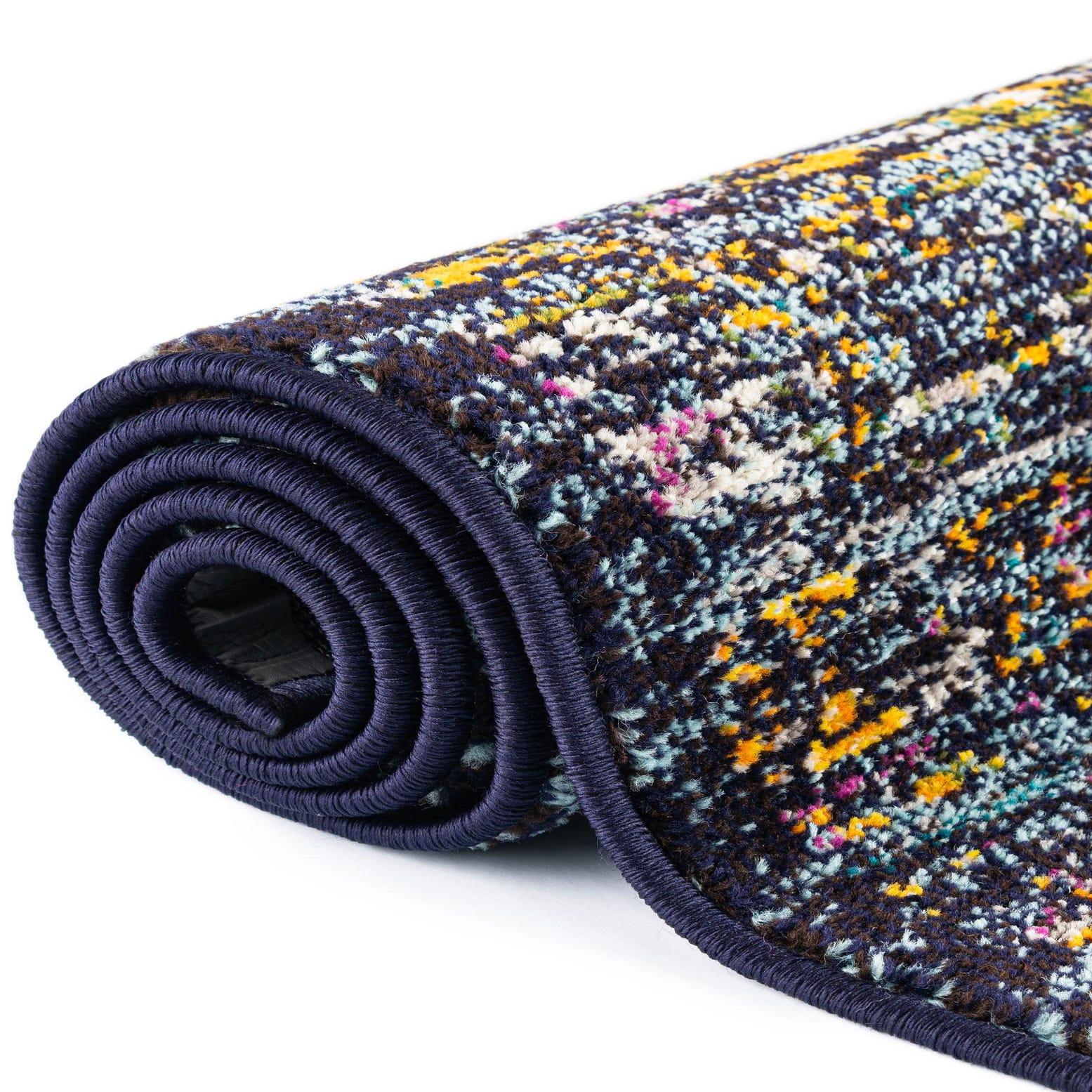 Primary color is Navy Blue. Colors in this rug include: Navy Blue, Beige, Brown, Green, Ivory, Light Blue, Orange, Teal, Yellow, Pink.