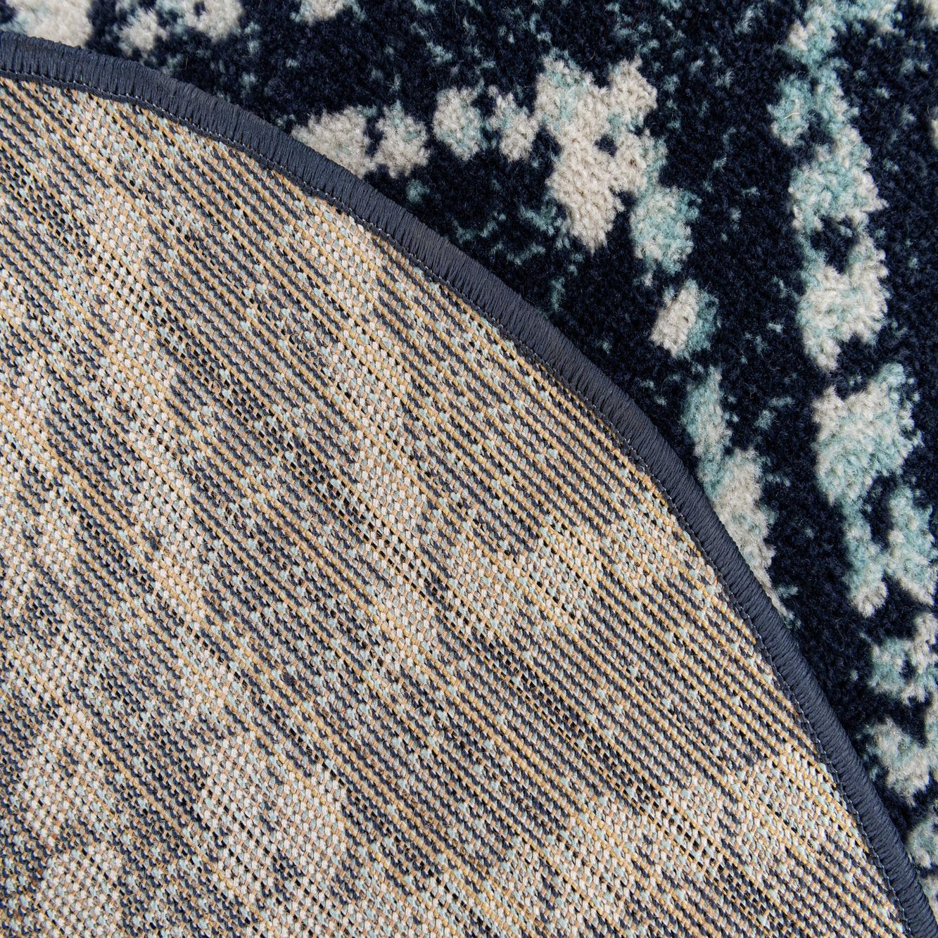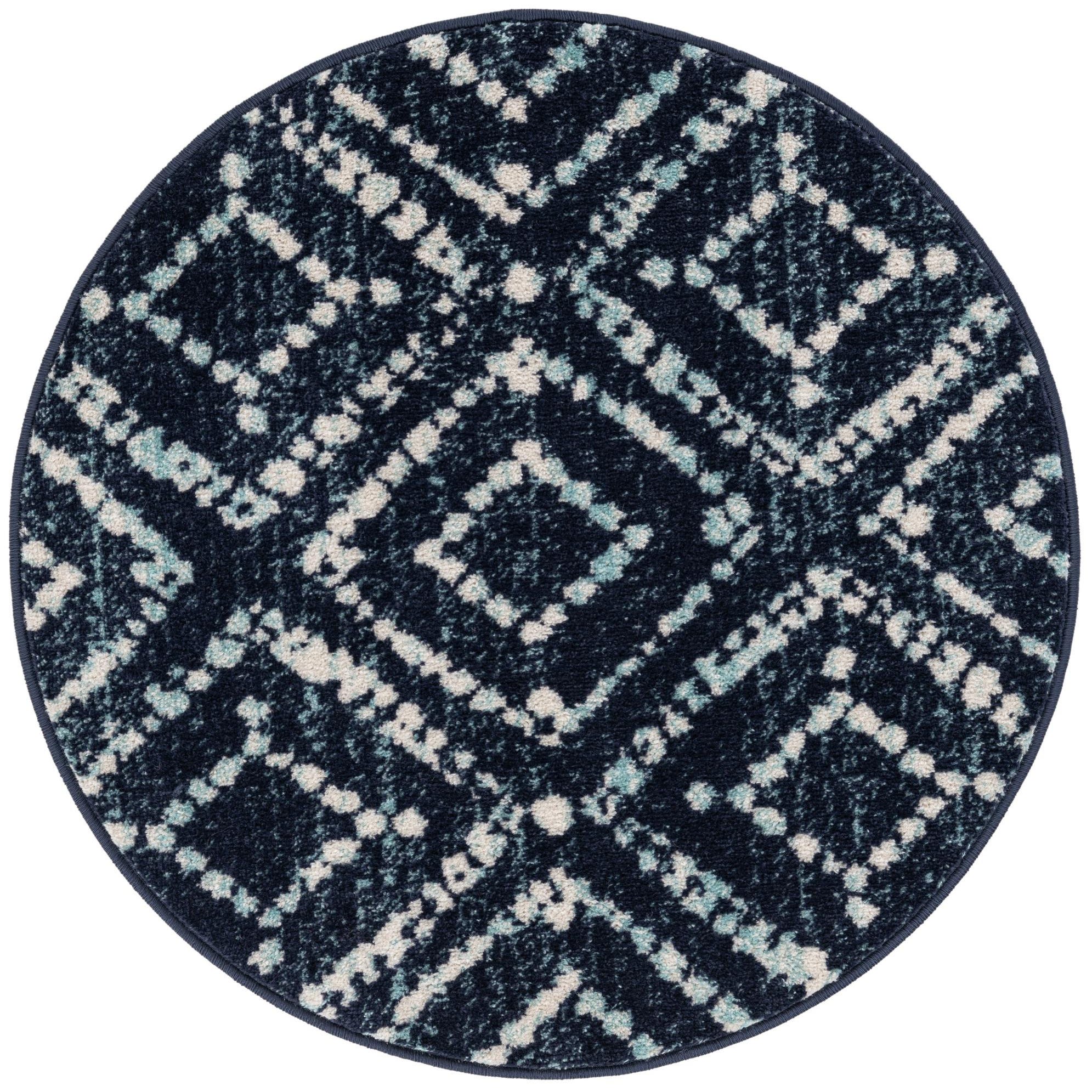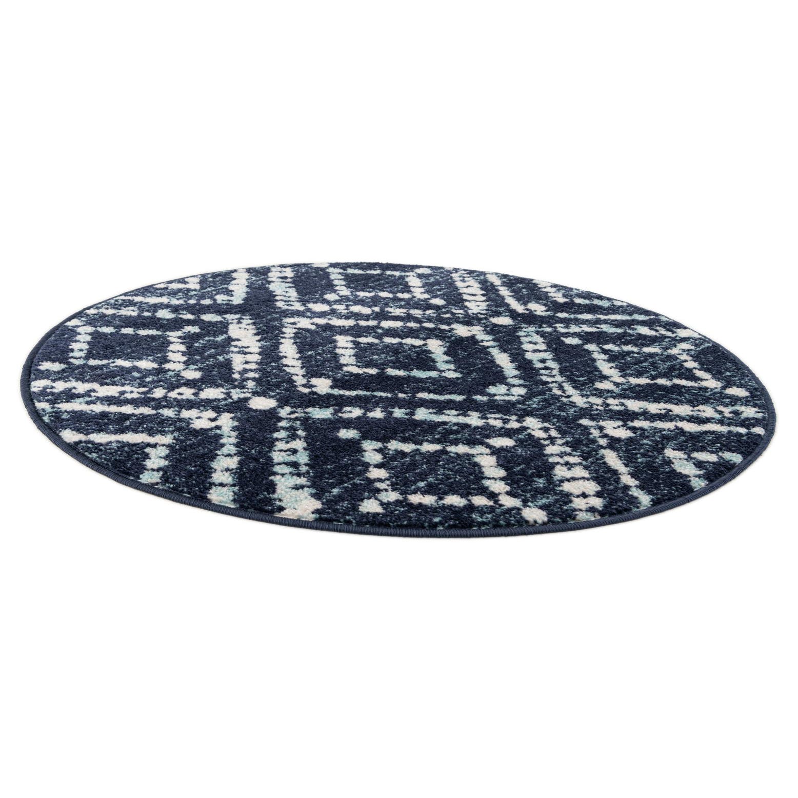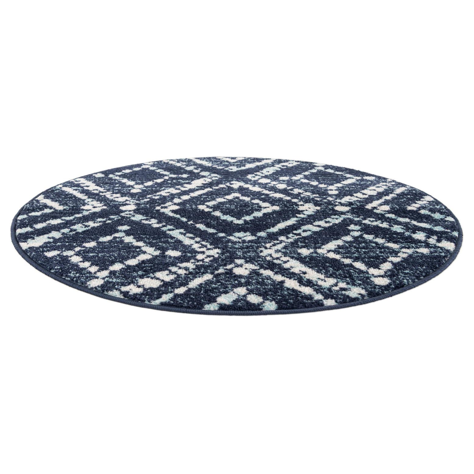A 3' round navy blue rug with a modern Moroccan trellis pattern in light blue and cream.