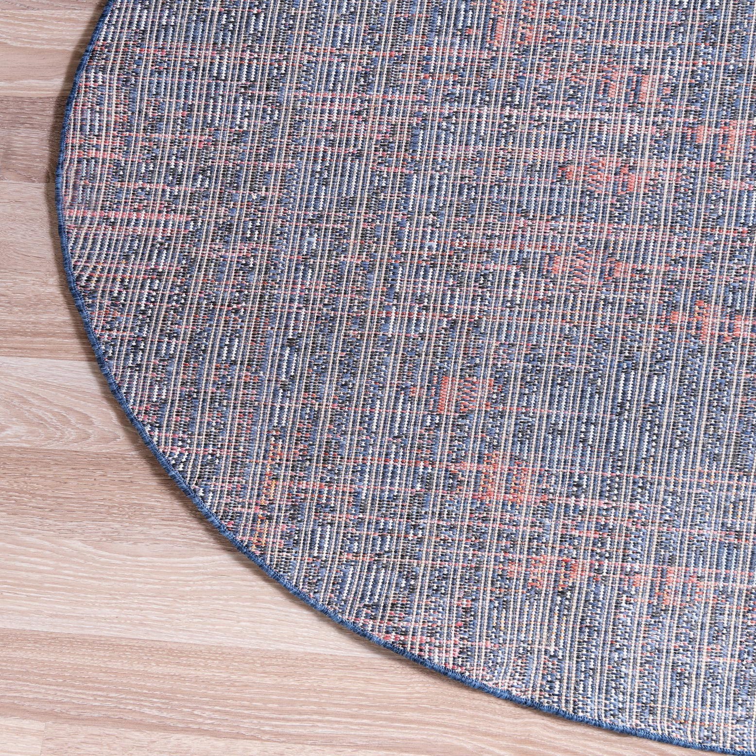 A rich navy field anchors a layered, distressed pattern of geometric and floral fragments in this round area rug. Ivory and light blue motifs contrast against the deep background while rust red, yellow and black accents punctuate the surface, creating a lively yet balanced palette. The design blends traditional tribal elements with a slightly worn, vintage-inspired look that fits both classic and contemporary interiors.