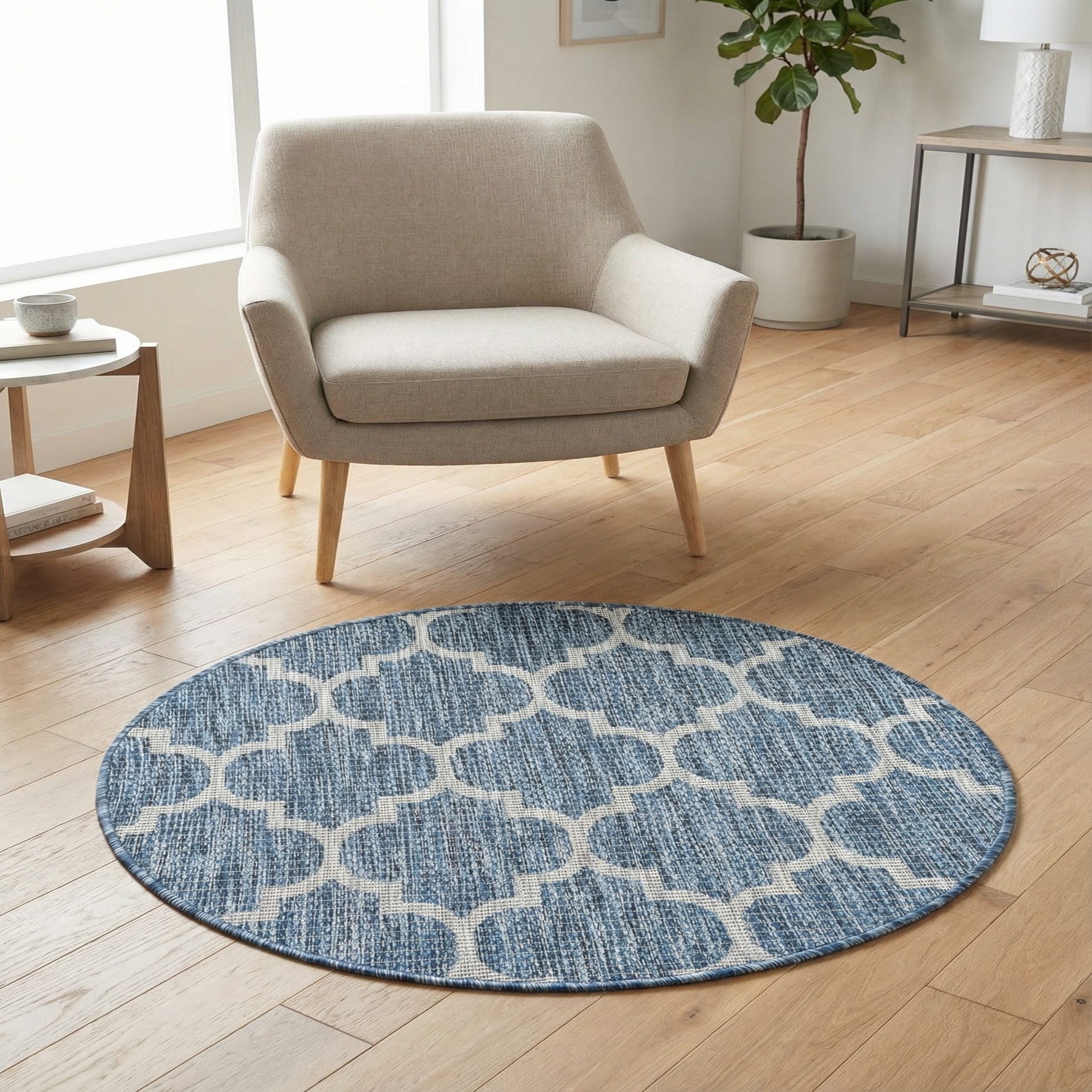 Place this rug to anchor a small outdoor seating area or a covered porch, tuck it beneath a bistro set on a balcony, or use it in a sunroom or casual dining nook to define the space. The navy-and-gray palette plays nicely with light woods, white or wicker furniture, and metal accents, and complements coastal, transitional, and modern farmhouse interiors. The round silhouette works especially well with circular tables and compact seating arrangements.