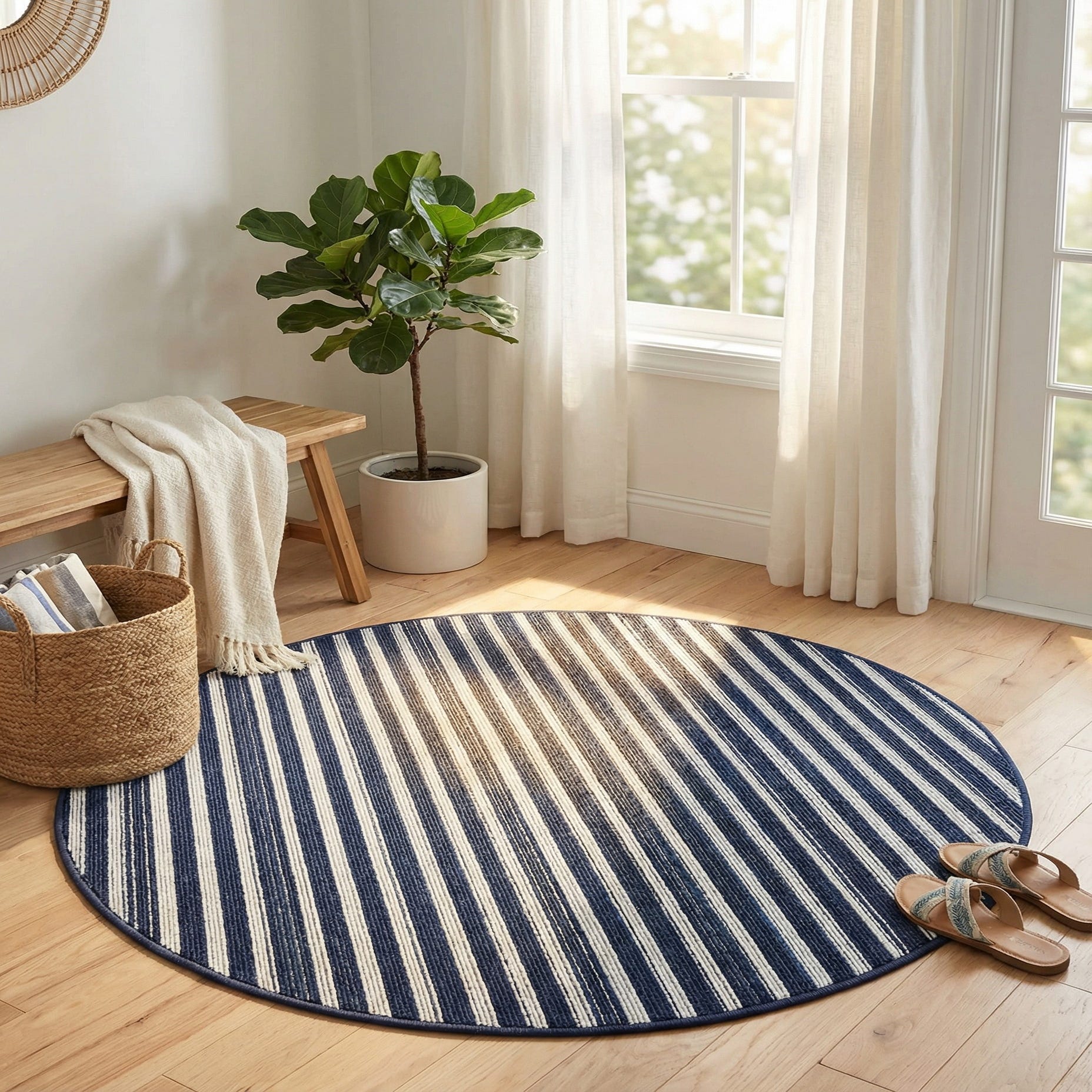 A round navy blue and white striped rug from the Sabrina Soto Outdoor collection, suitable for indoor/outdoor use.