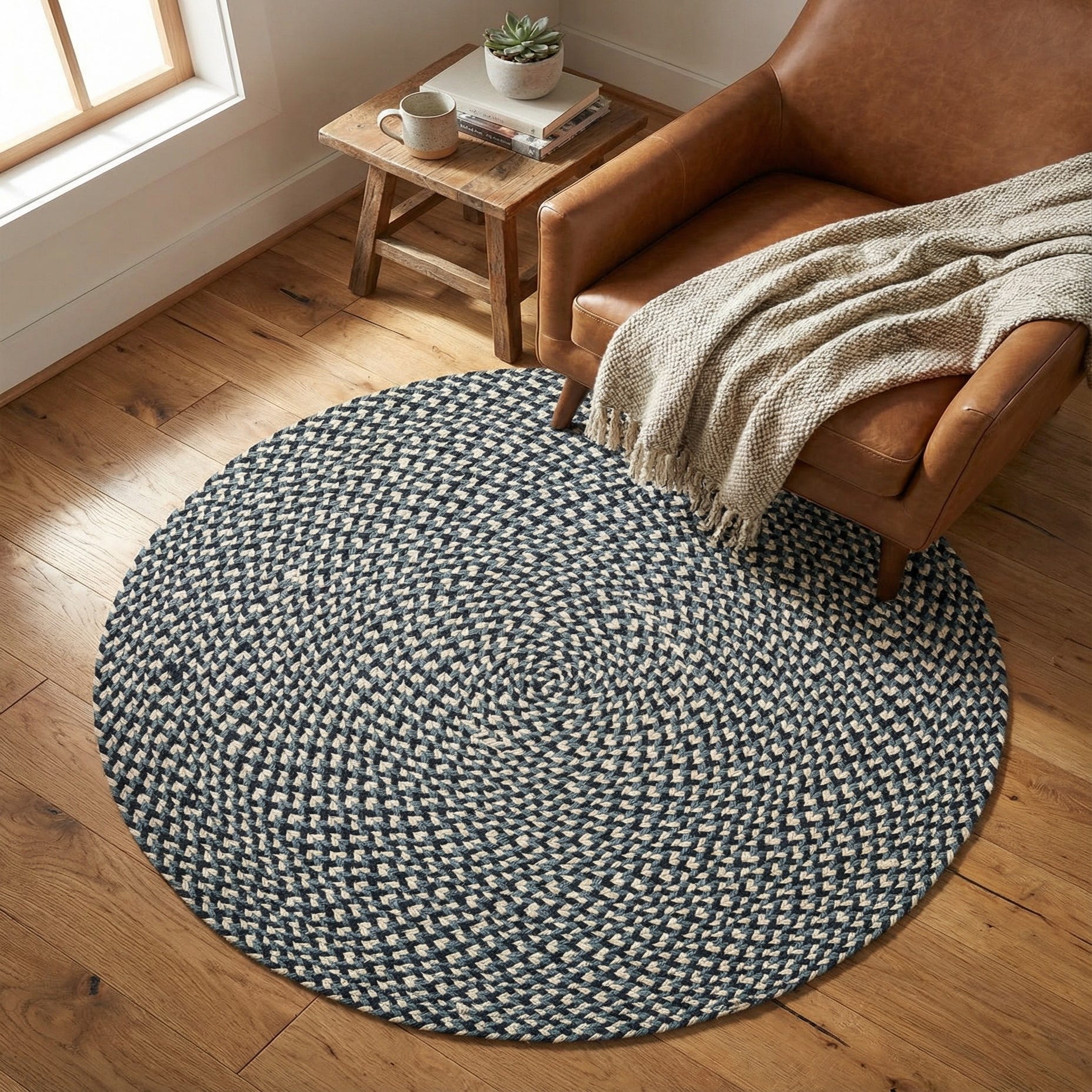 A tightly braided spiral pattern alternates navy blue and natural jute strands to create a lively, two-tone surface with a subtle chevron effect. The concentric braids give the round shape clear definition while the navy background anchors the design, letting the lighter jute highlights pop without overpowering a room.