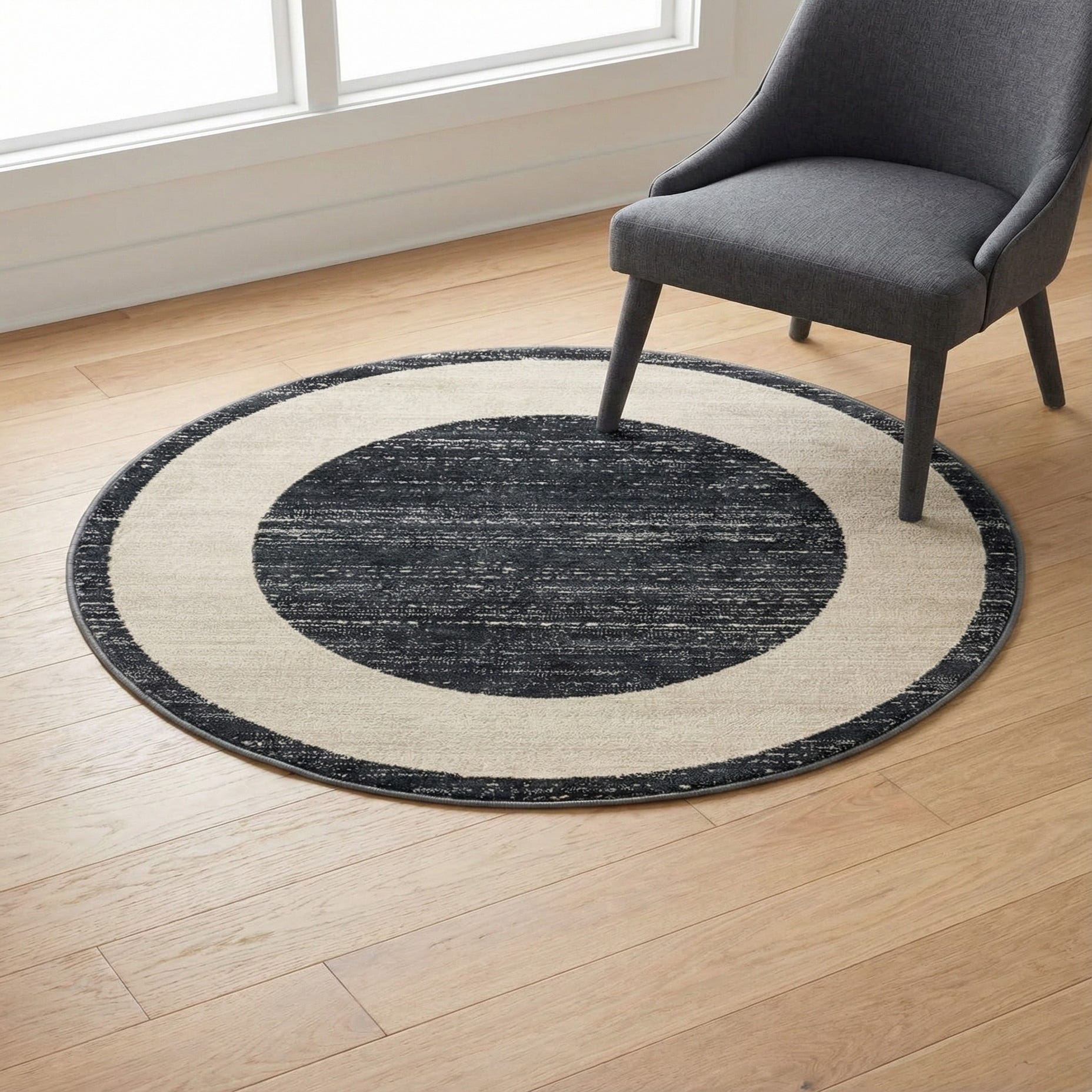 A bold circular motif anchors this round rug with a deep navy blue background framed by a wide ivory ring and a narrow navy outer band. The navy center includes subtle striations of lighter fibers that give the surface a slightly weathered, textured look without distracting from the strong geometric silhouette. Machine-made construction produces a low, even pile you can feel underfoot: the polypropylene delivers a smooth, dense touch while the polyester fibers add a soft finish and a gentle sheen.
