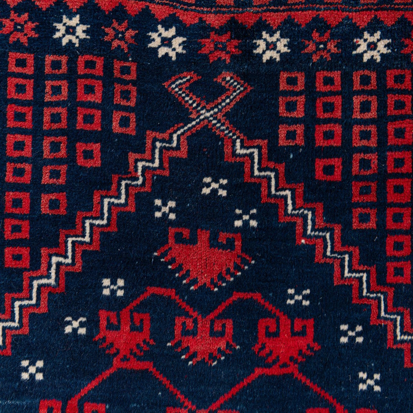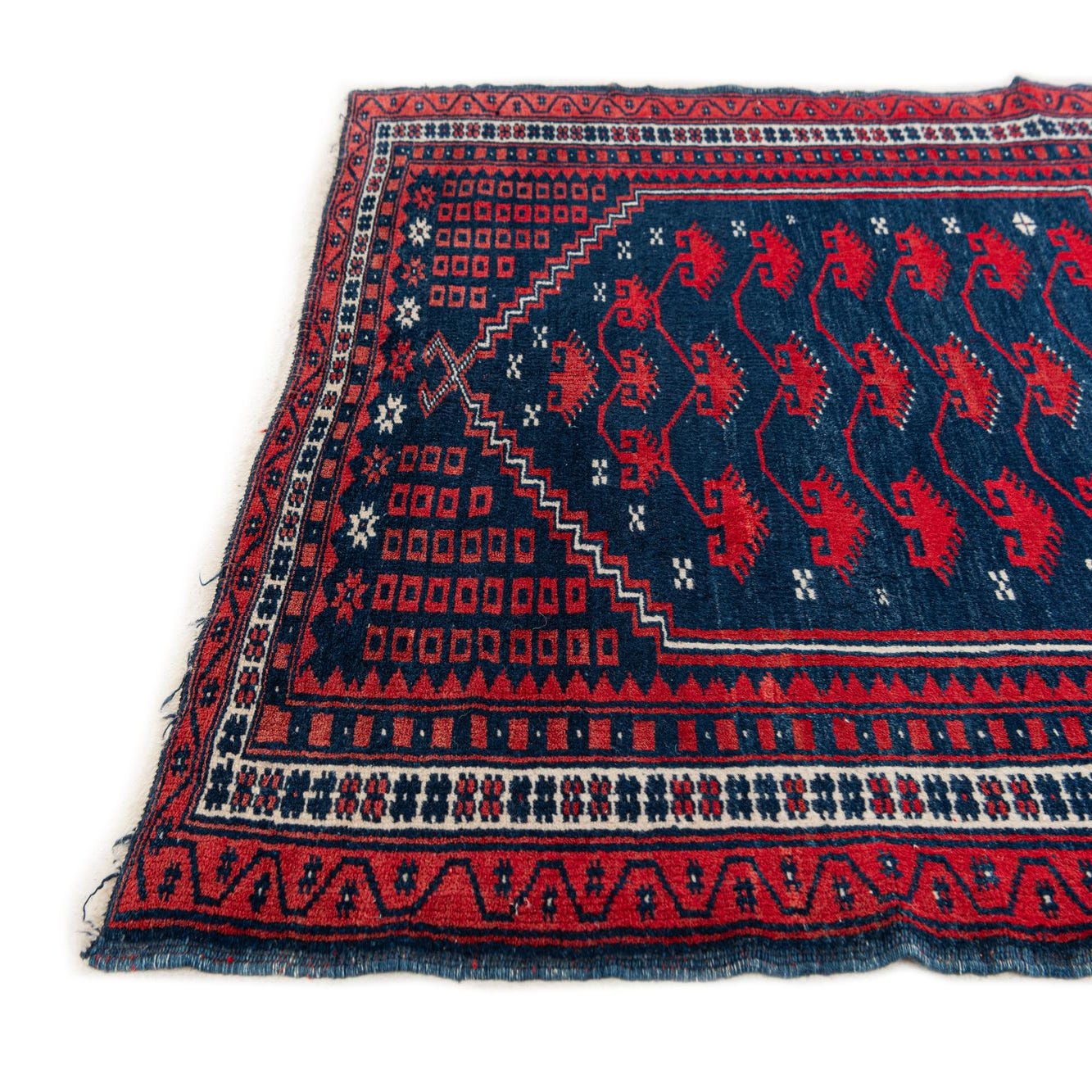 A 2' 8 x 3' 3 square Balouch rug with a deep navy blue field and intricate red, white, and light blue traditional tribal patterns.