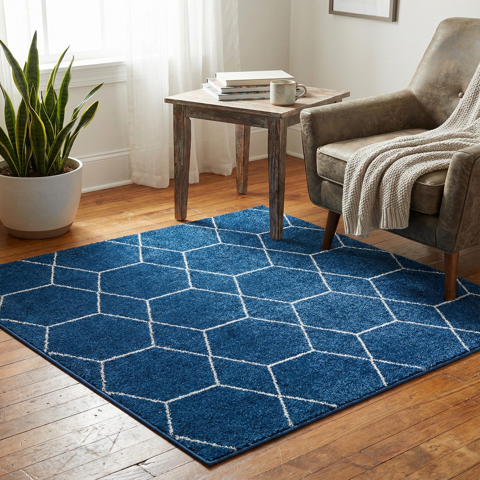 A bold navy background frames a crisp ivory hexagonal lattice for a modern geometric look. The interlocking hexagons create a rhythmic pattern that adds visual interest without overwhelming a room. Machine-made from 100% polypropylene, the rug has a frieze-style, low-profile pile with a soft, textured hand that feels comfortable underfoot and offers a subtle, casual sheen.