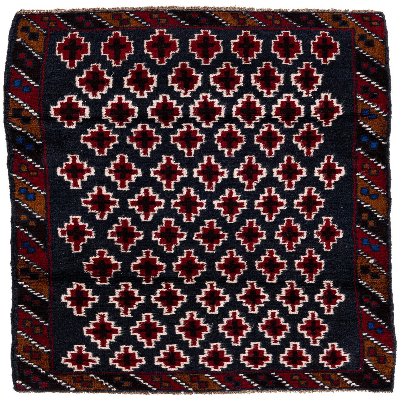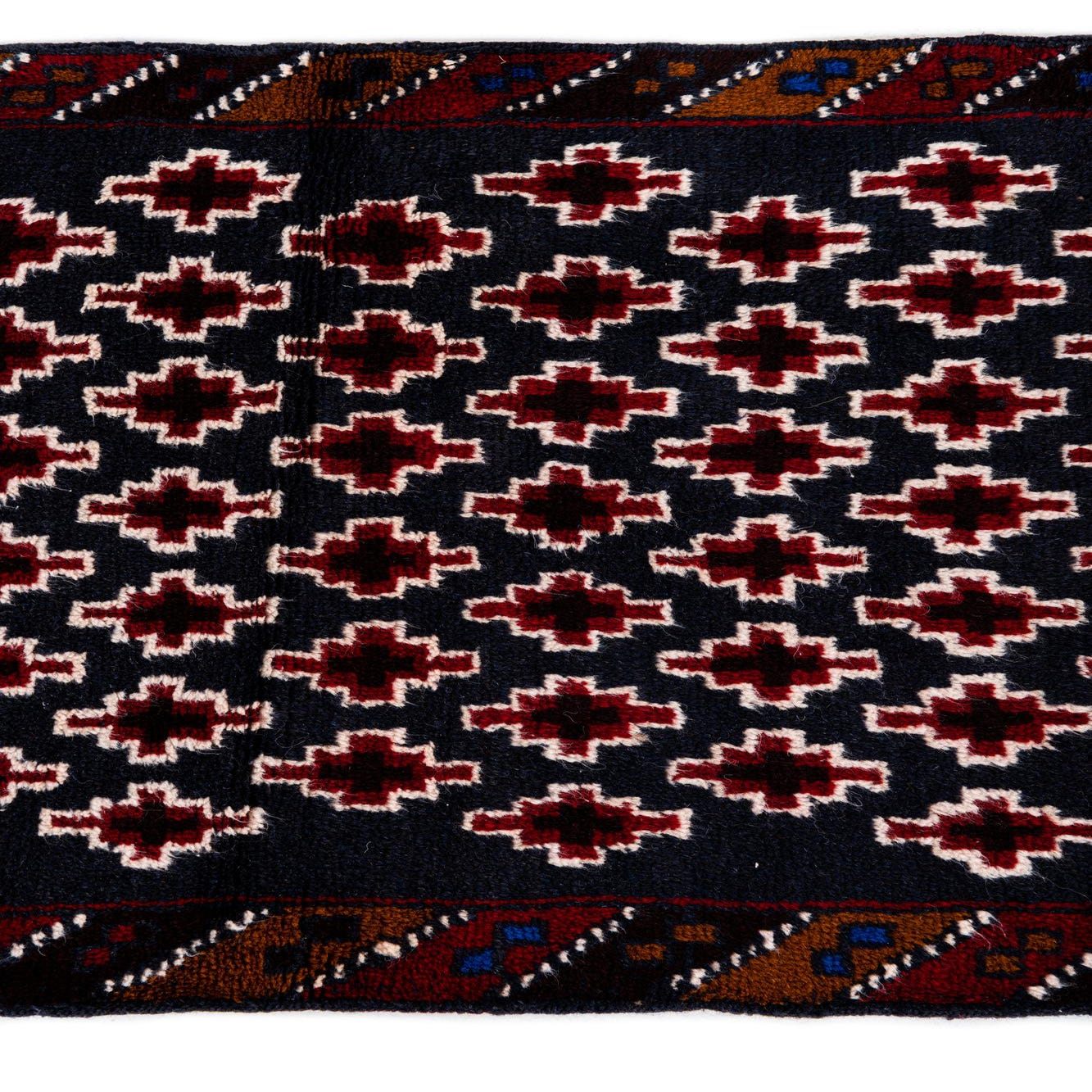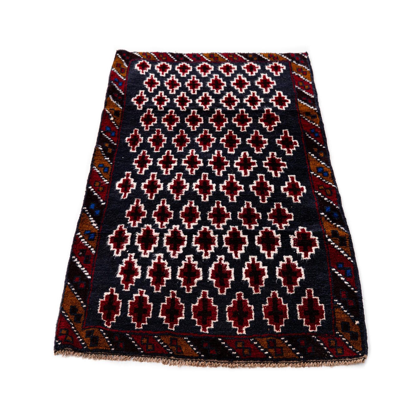 A 3x4 rectangular Balouch rug with a navy blue field and repeating red, black, and white tribal geometric patterns, framed by a multi-colored border.