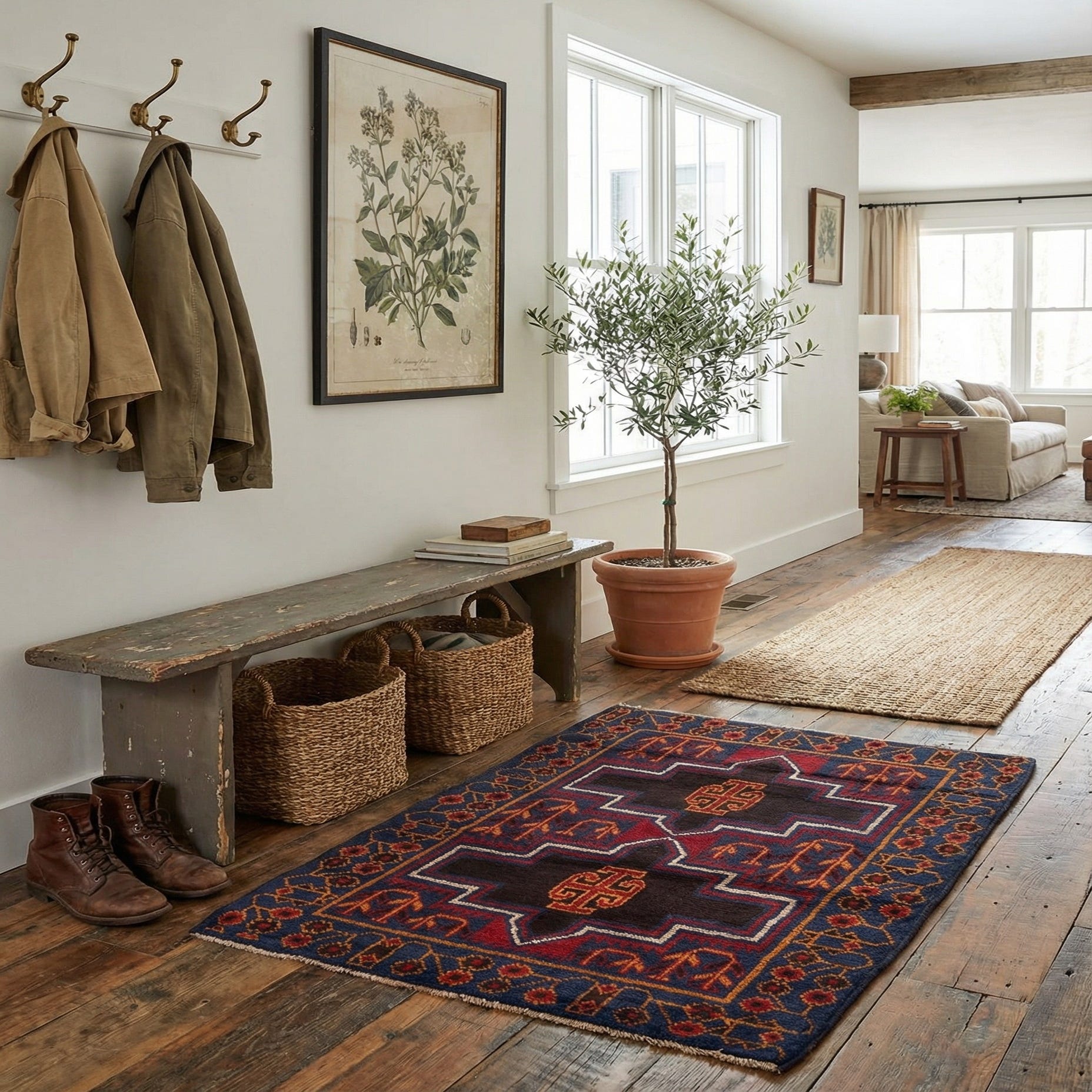 Primary color is Navy Blue. Colors in this rug include: Navy Blue, Beige, Brown, Burgundy, Maroon, Terracotta.