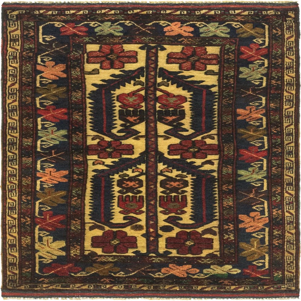 This hand-knotted Sumak rug, measuring 3x4, is crafted with 100% wool, offering a robust texture and enduring quality. Its navy blue background is accented with a diverse palette that includes beige, brown, maroon, olive, peach, red, and green, providing a rich variety of hues that can complement an array of color schemes.