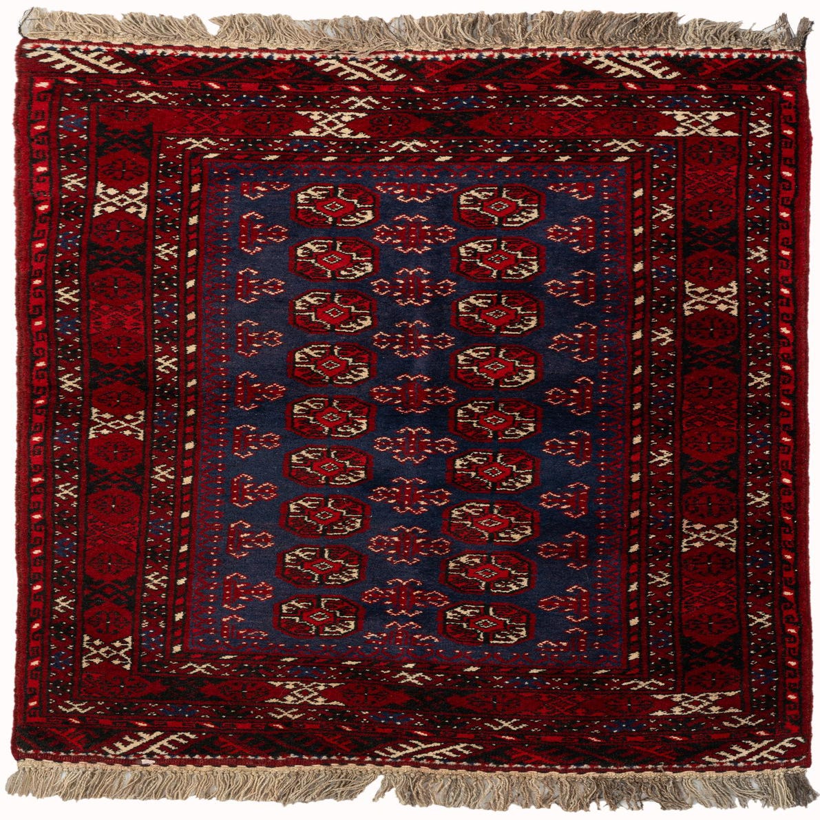 A 3x5 rectangular Afghan Akhche rug featuring a deep navy blue field with red and cream tribal medallions, bordered by a rich red pattern, and finished with natural fringe.