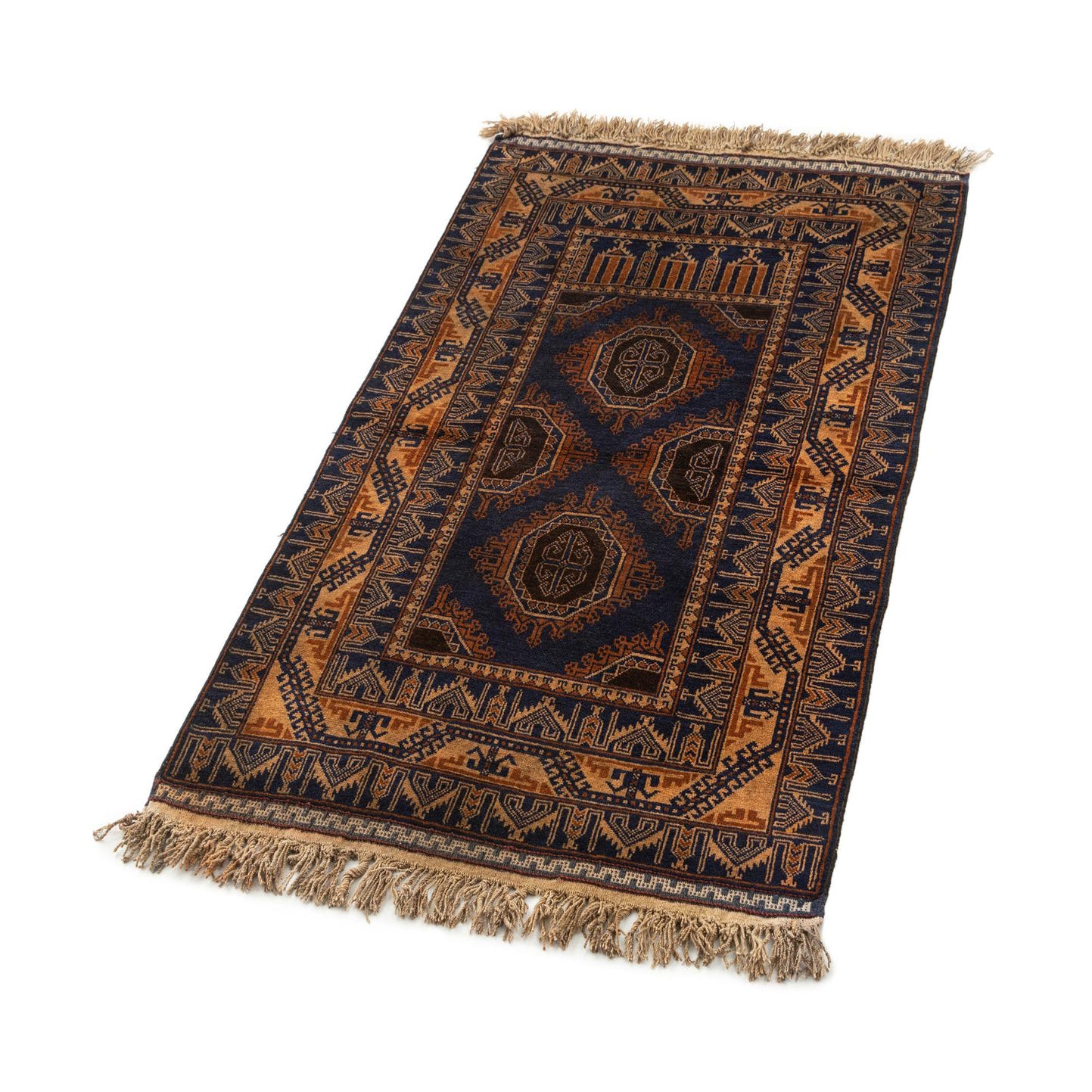 A 3x5 rectangular Afghan Akhche rug featuring a deep navy blue field with intricate tribal and oriental patterns in tan and brown, finished with natural fringe.