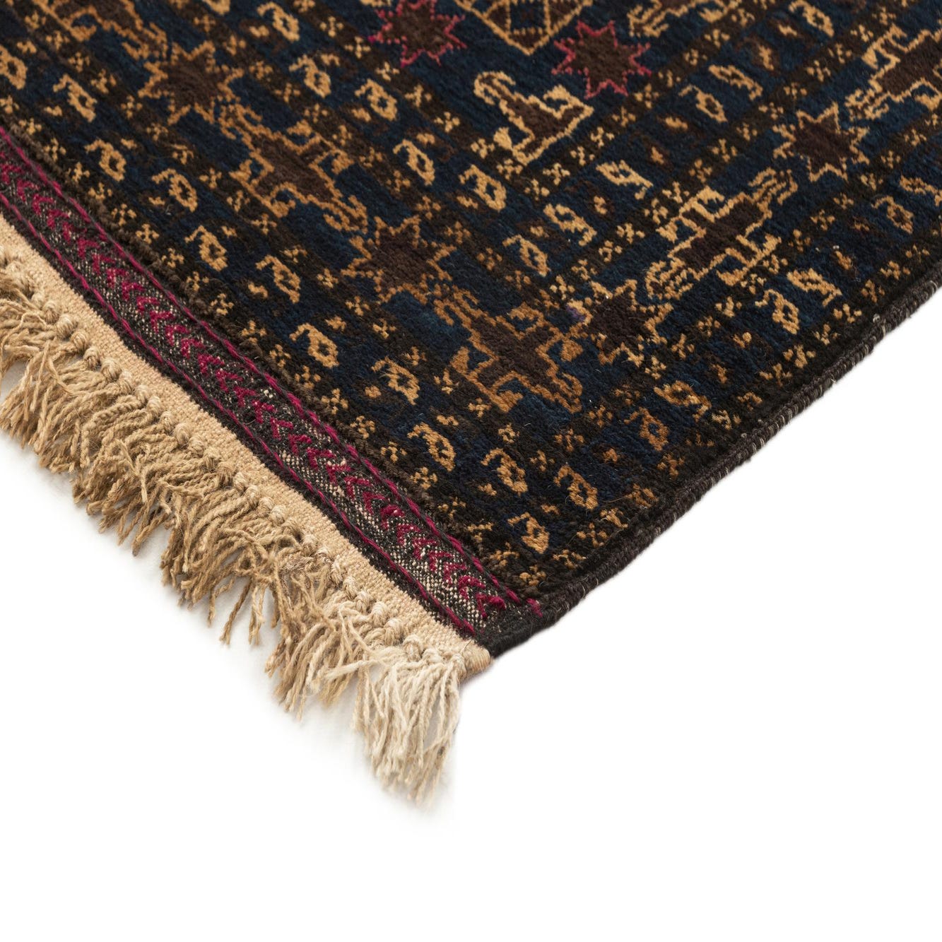 A rectangular 3x5 Afghan Akhche rug with a dark navy blue background and intricate tribal patterns in gold and hints of red, featuring natural fringe.