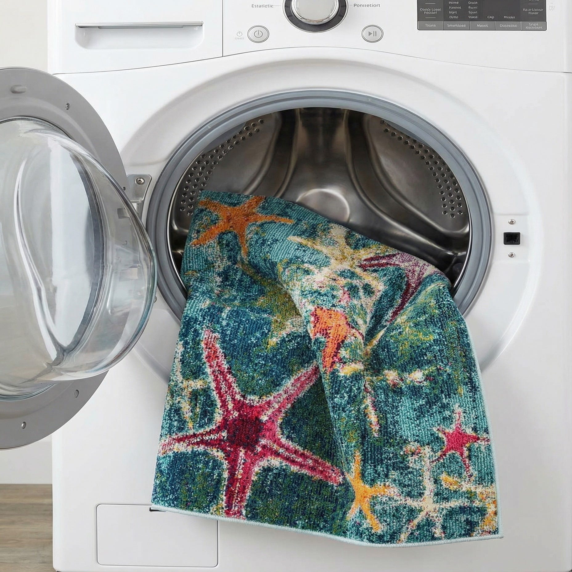 A rectangular 3x5 indoor rug featuring a vibrant blue and green background with scattered orange, pink, and white starfish.