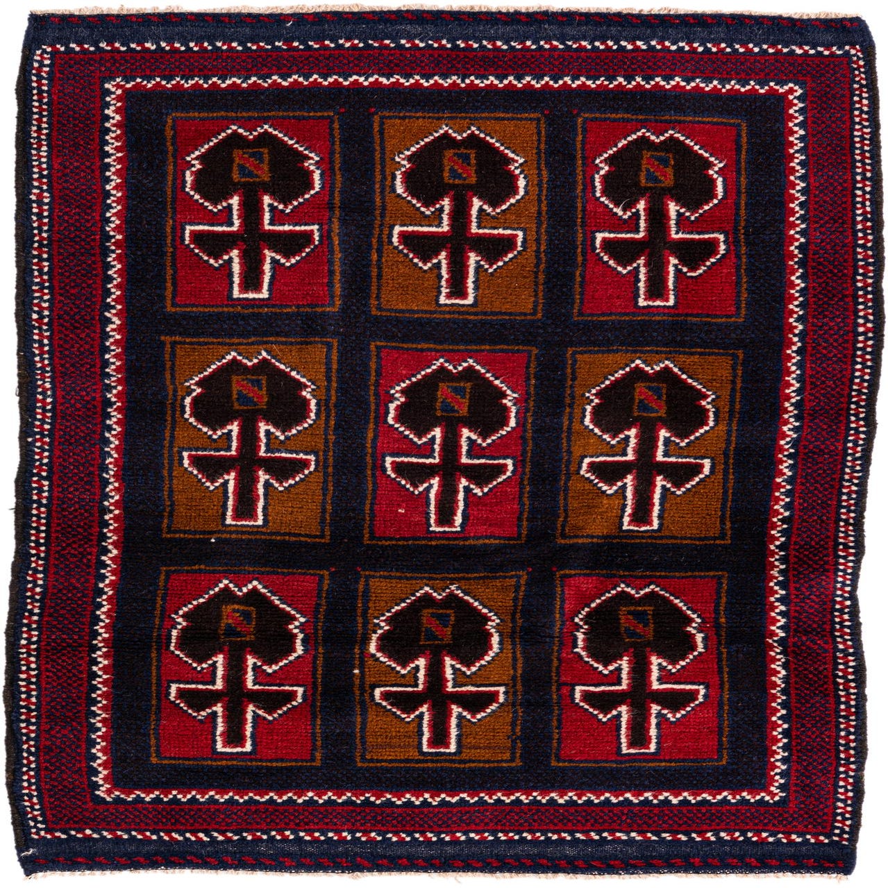 A 3x5 rectangular Balouch rug with a navy blue field and a traditional tribal pattern of alternating red and brown squares, each containing a stylized black and white motif.