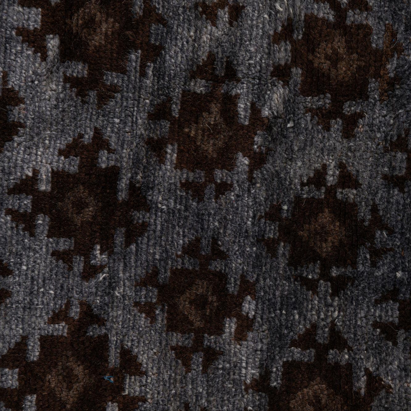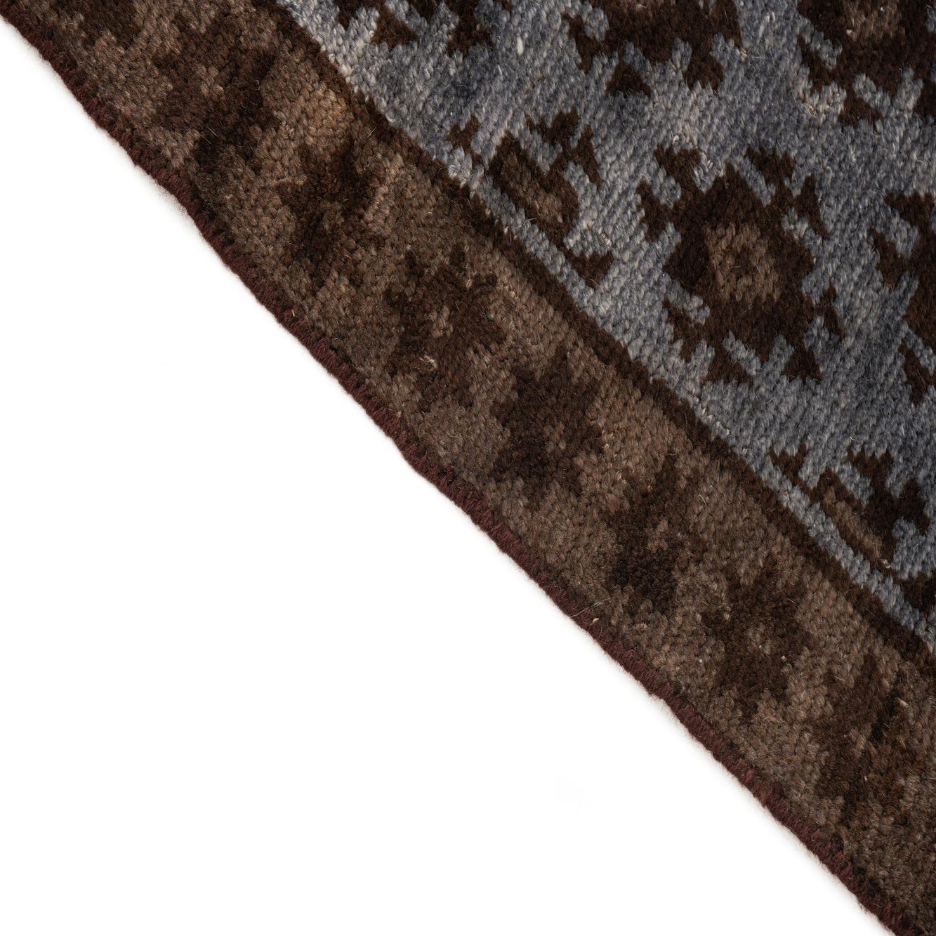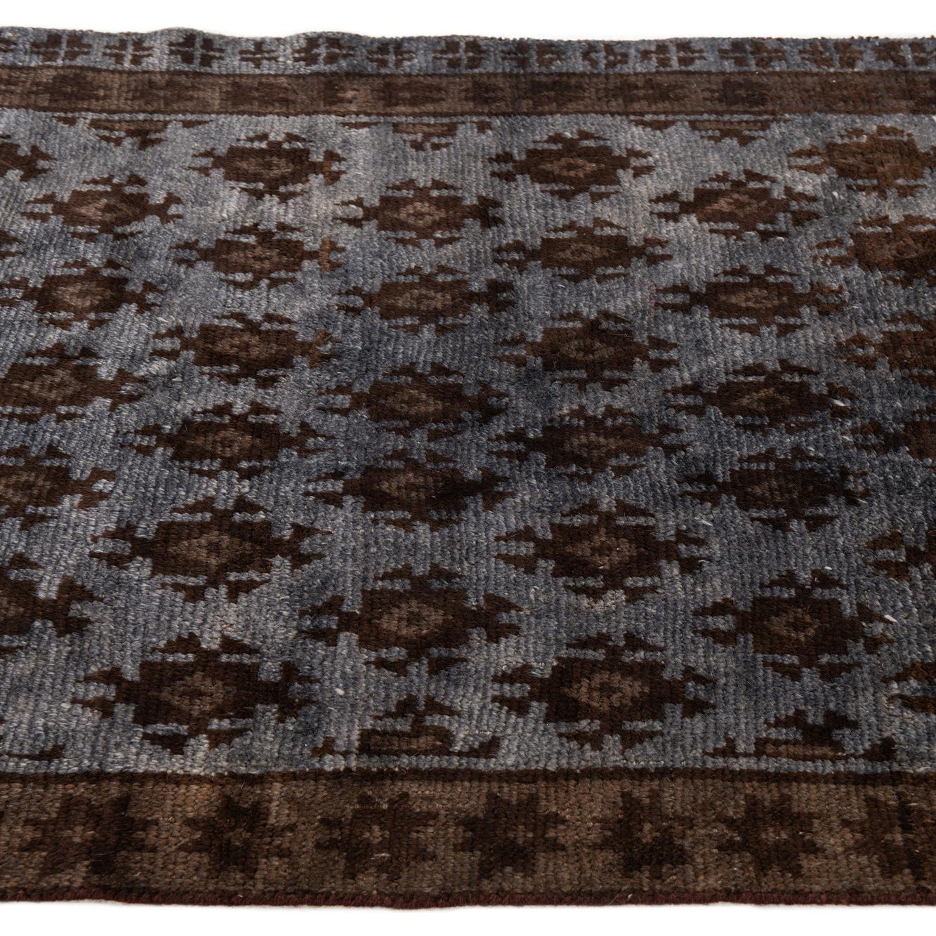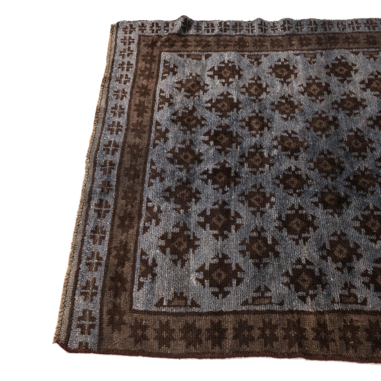 A 3x5 rectangular Balouch tribal rug featuring a faded navy blue field with repeating dark brown geometric motifs and a matching dark brown border.