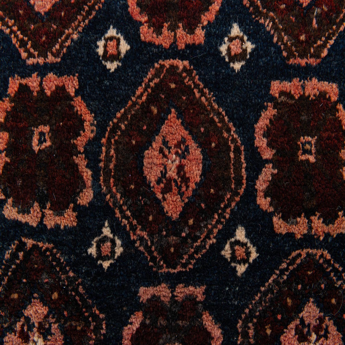 Primary color is Navy Blue. Colors in this rug include: Navy Blue, Brown, Ivory, Rust Red, Light Brown.