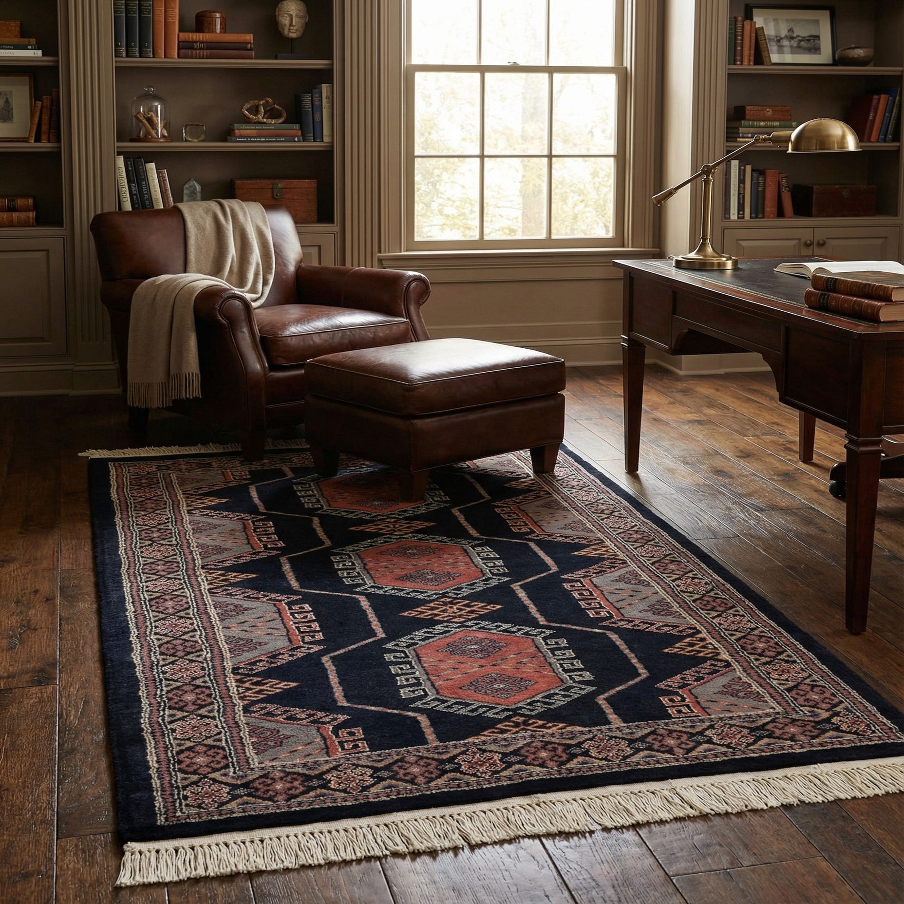 Primary color is Navy Blue. Colors in this rug include: Navy Blue, Black, Burgundy, Gray, Ivory.